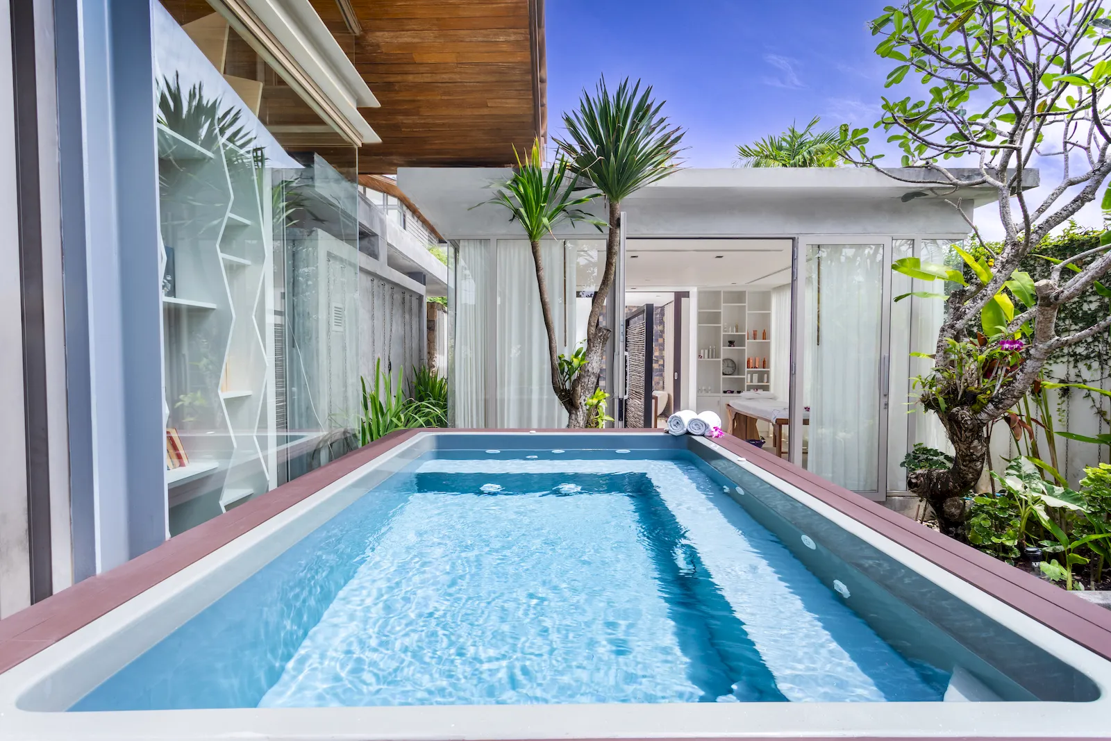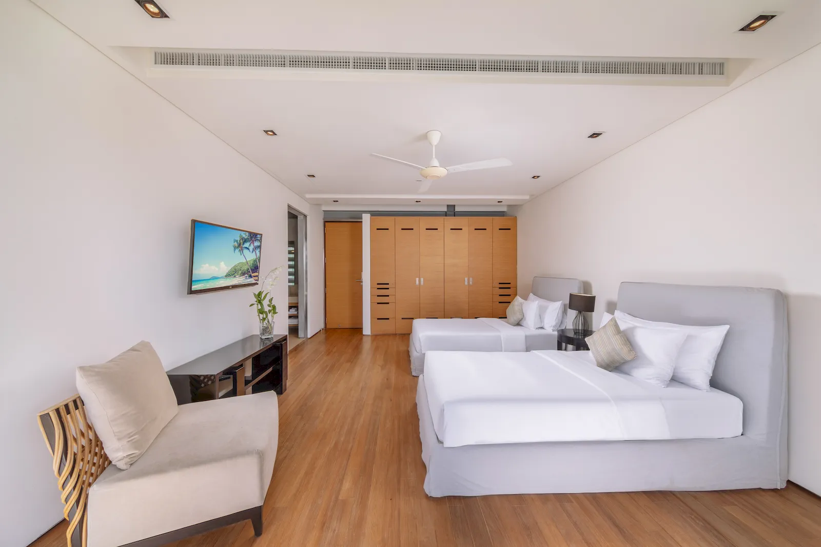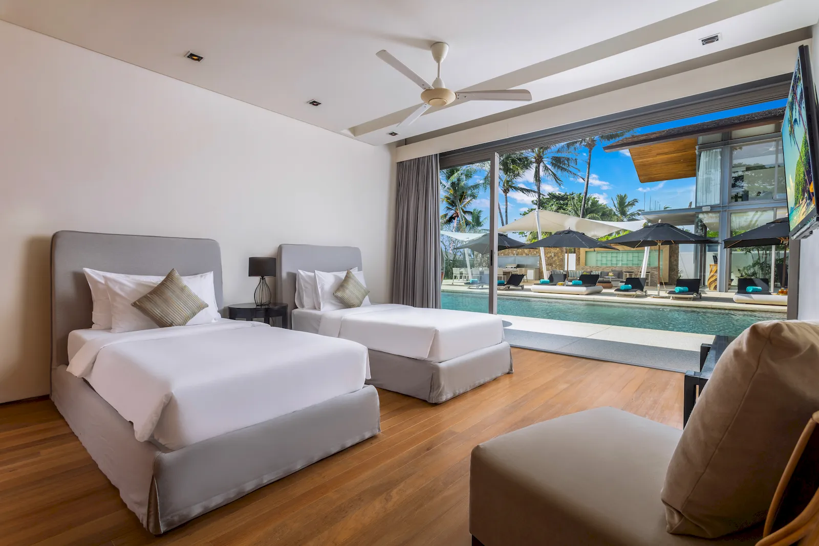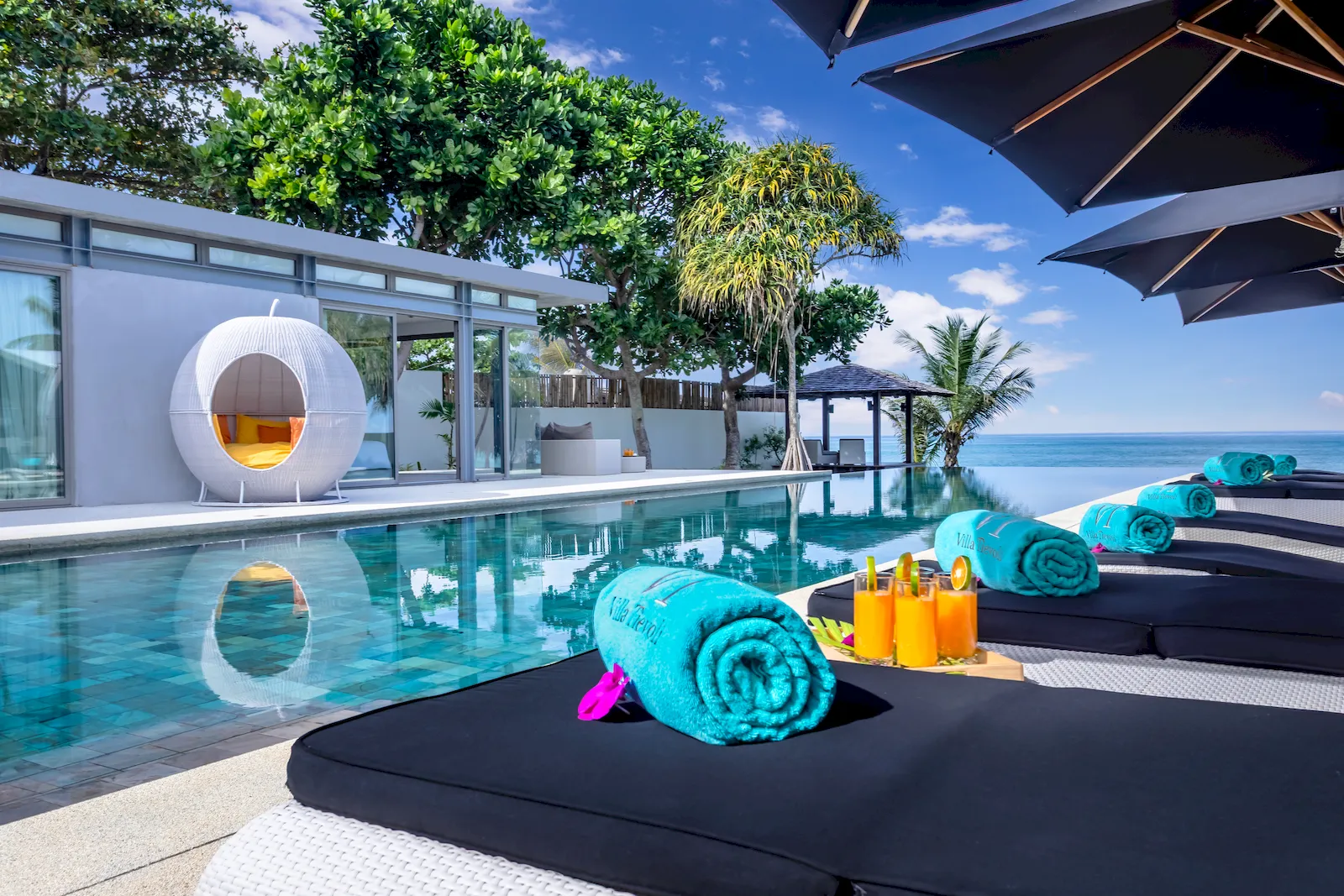 Conceived as a modern tropical villa with an emphasis on indoor–outdoor living, this beachfront home features floor-to-ceiling glass, warm timber accents, and a bright, open-plan layout that immerses every space in natural light and ocean views. The main living and dining areas flow seamlessly onto the pool terrace, where a 25-metre infinity pool stretches toward the horizon and is complemented by a poolside bar, barbecue zone, sun loungers, and shaded relaxation. Inside, a dedicated media and games room, a children’s playroom, and a carefully planned bedroom configuration—including two master suites, multiple guest bedrooms, and a fun, secure kids’ bunk room—ensure complete comfort for up to 14 adults and 4 children. A standout feature is the private spa suite, with a large terrazzo soaking tub, steam room, sauna, treatment beds, and salon space for hair and nail services, creating the feel of a personal wellness retreat within a luxury villa Phuket environment.