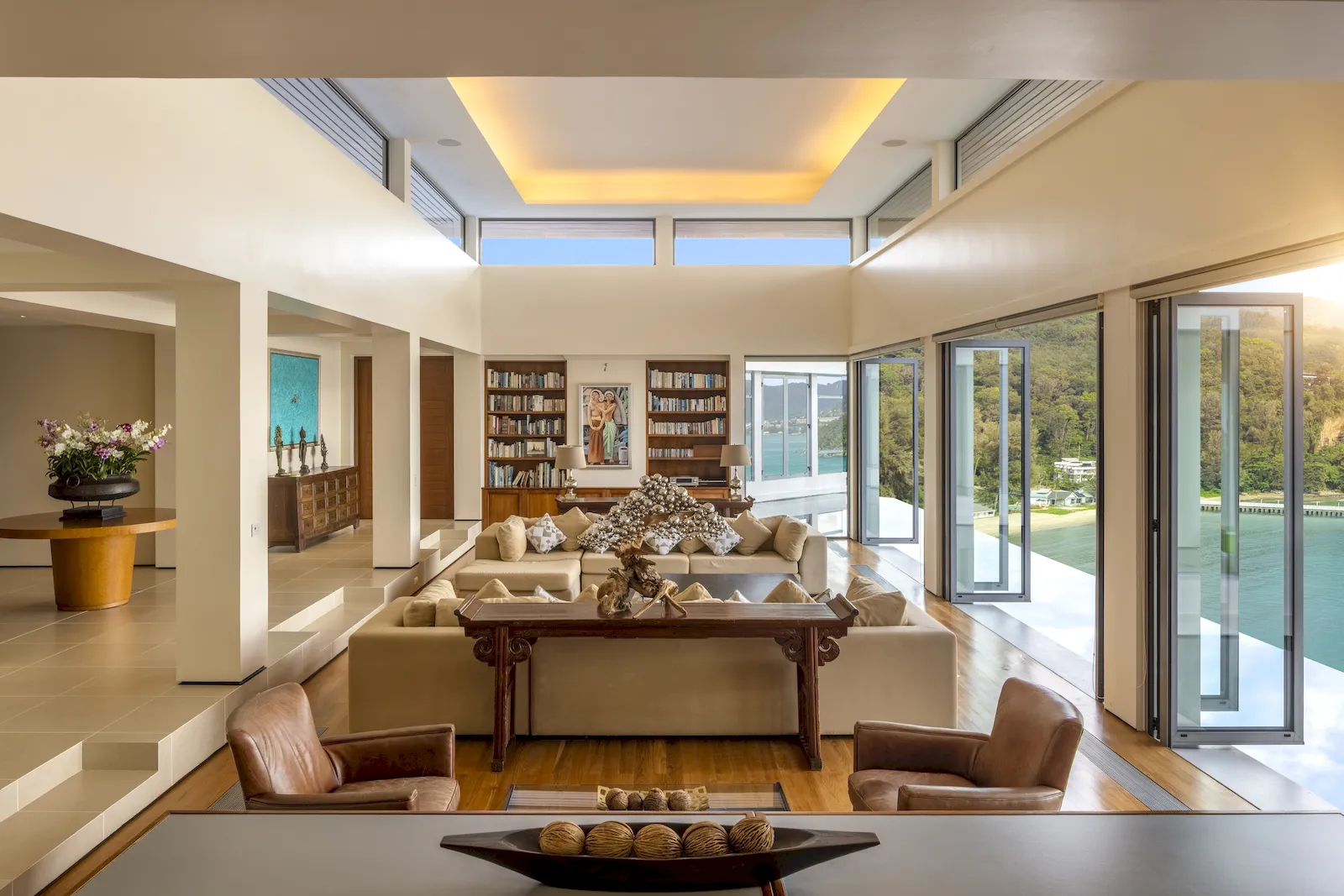 The villa features bold horizontal lines, dramatic arrival spaces, and expansive indoor–outdoor areas that flow naturally toward panoramic Andaman Sea views. A grand entrance hall, double-height living room, and onyx-tiled reflecting pond create a remarkable sense of arrival. Floor-to-ceiling glass panels capture natural light throughout the day, while open-plan lounges, refined dining areas, and an 18-meter saltwater infinity pool provide an exquisite environment for relaxation and entertaining. All five ensuite bedrooms are designed with luxurious finishes, generous wardrobes, and sweeping ocean or pool vistas, with the master suite enjoying a private upper-level position.