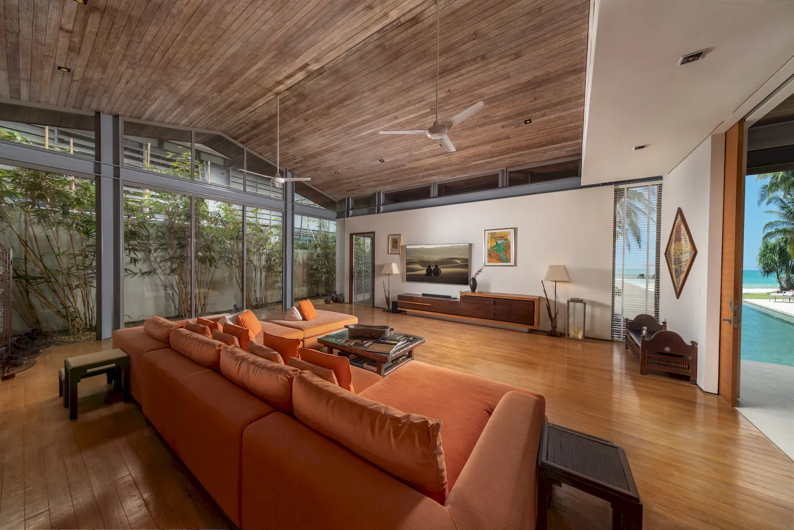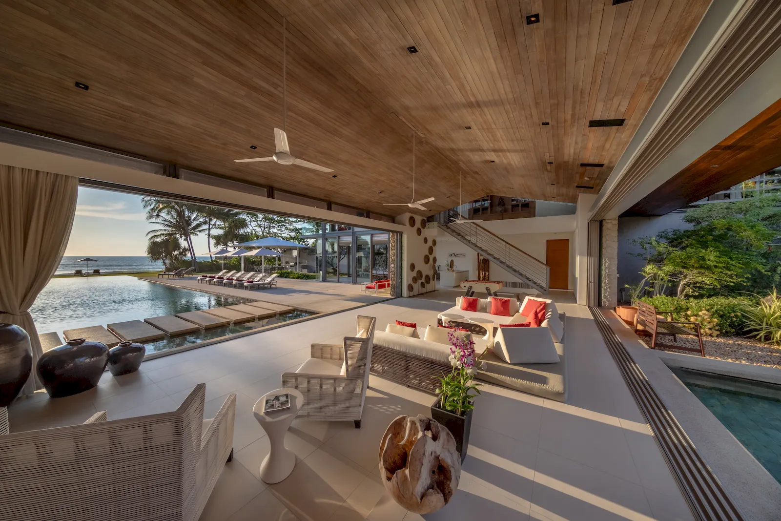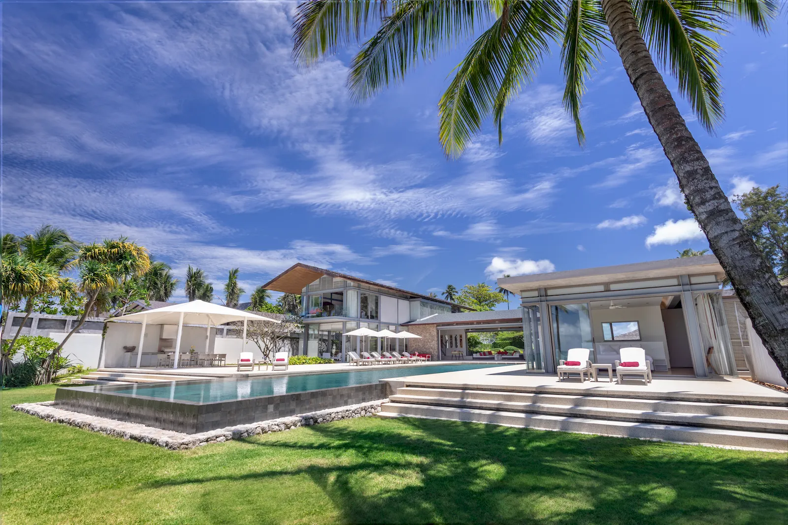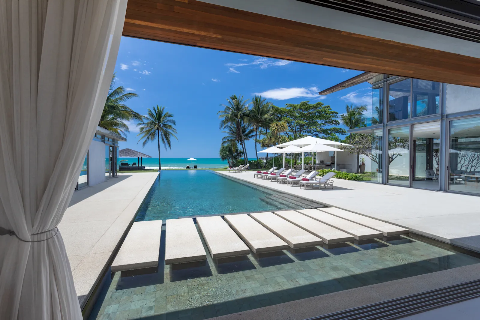 Thoughtfully crafted for families and groups, this modern tropical villa features sunlit interiors, open-plan living and dining areas, and smooth transitions between indoor comfort and outdoor freedom. A striking 25-meter saltwater infinity pool serves as the focal point of the estate, extending visually into the horizon and surrounded by ample sun loungers, shaded decks, and direct access to the soft sands of Natai Beach. Six bedrooms—including two master suites and versatile guest rooms—are designed with privacy, comfort, and flexibility in mind. Fully equipped Western and Thai kitchens, elegant dining settings, and carefully selected materials reinforce the villa’s sophisticated yet welcoming character.