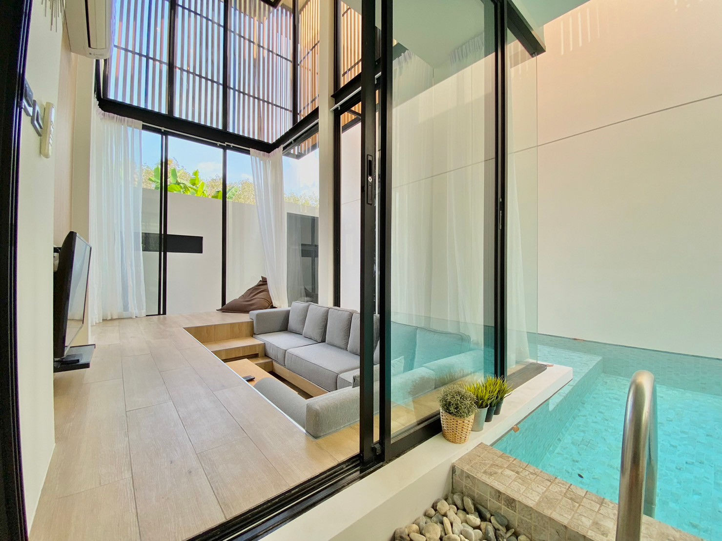 The villa offers a refreshing balance of indoor comfort and outdoor relaxation. The private pool area provides an inviting setting for leisure, while landscaped garden elements enhance privacy and create a resort-style ambiance. A balcony on the upper level offers additional space for morning coffee or quiet evening relaxation.