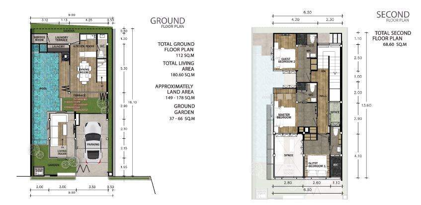 Thoughtfully planned across two levels, the villa offers a total living area of 180.60 sq.m on an approximately 165 sq.m land plot. The ground floor features 112 sq.m of functional living space, including a bright open-plan living and dining area, a fully equipped Western kitchen, a guest WC, and convenient service and storage areas. The second floor comprises 68.60 sq.m, including well-designed bedrooms, private balconies, and calming garden views.