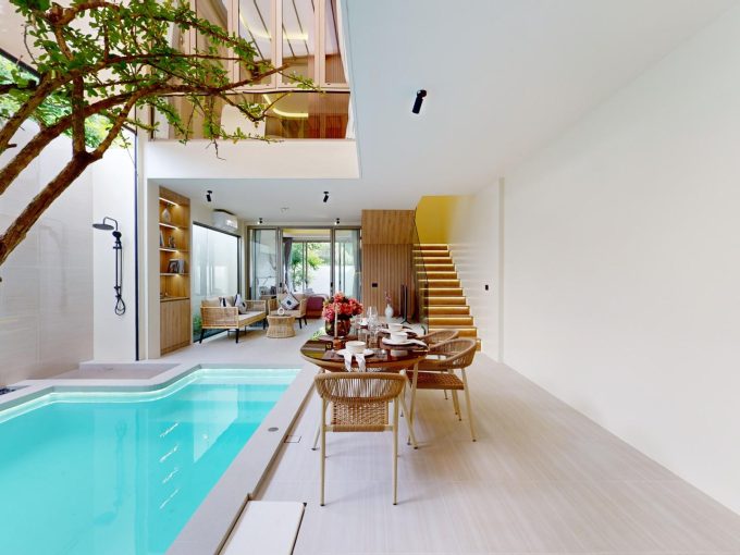 The villa centres around a private swimming pool surrounded by a landscaped garden—perfect for relaxing, entertaining, or enjoying Phuket’s tropical climate. Many layouts also include a rooftop garden, offering an elevated outdoor retreat ideal for sunset gatherings, yoga, or quiet leisure.