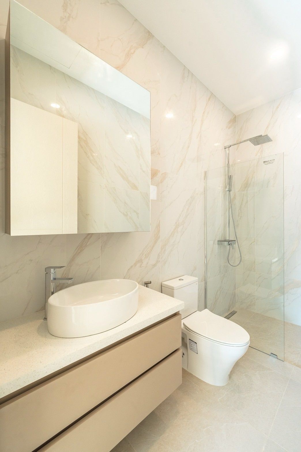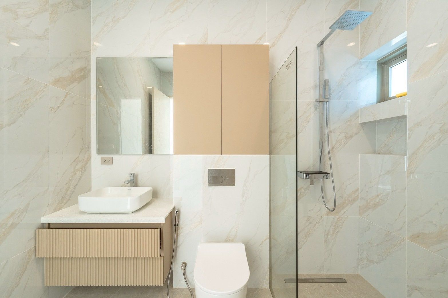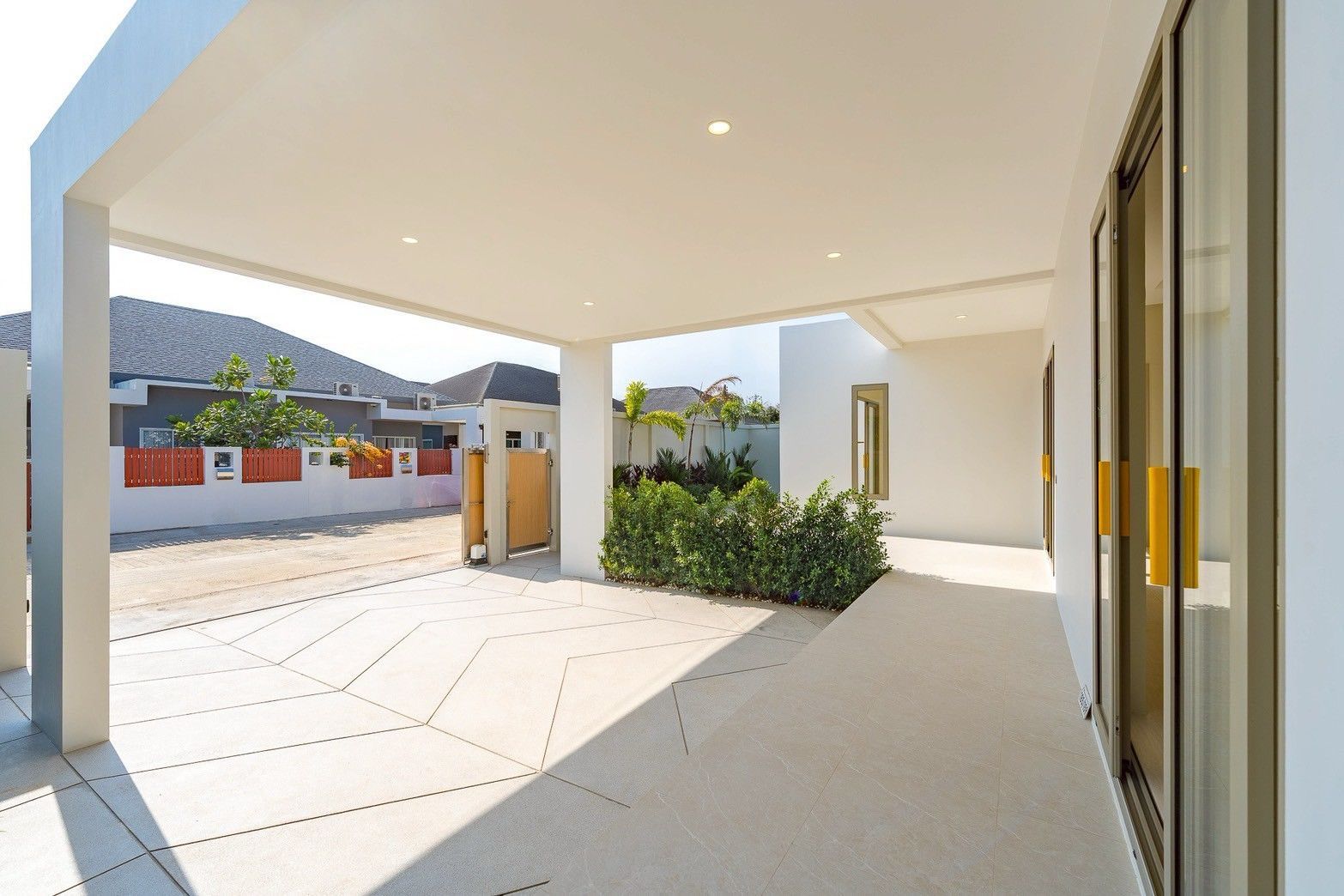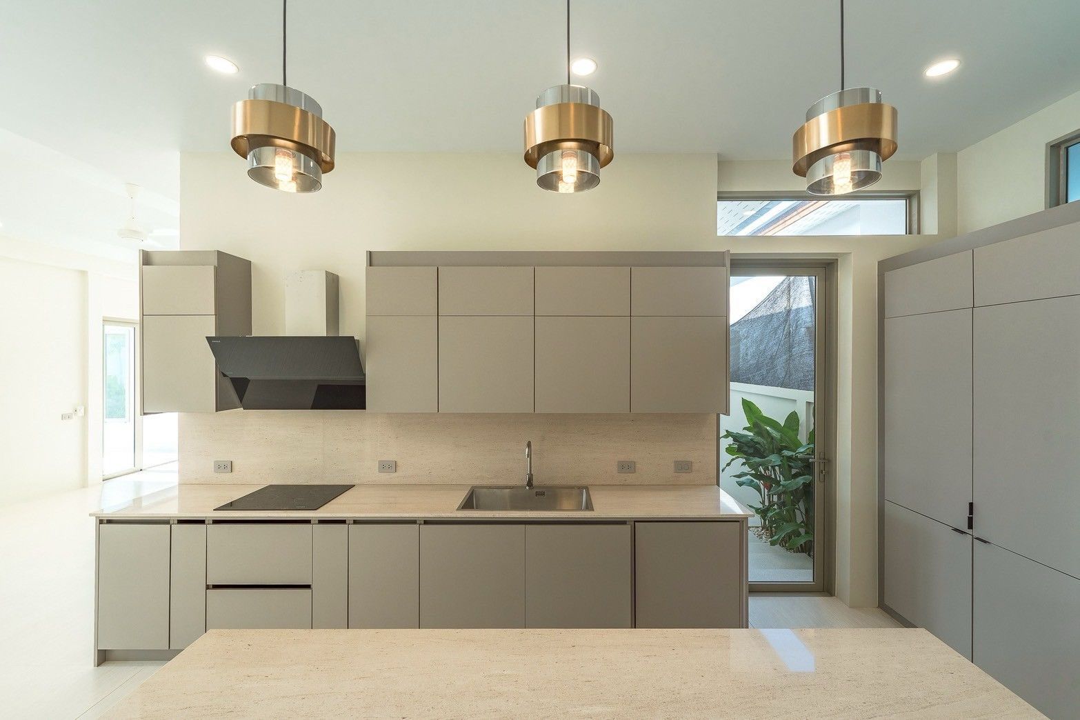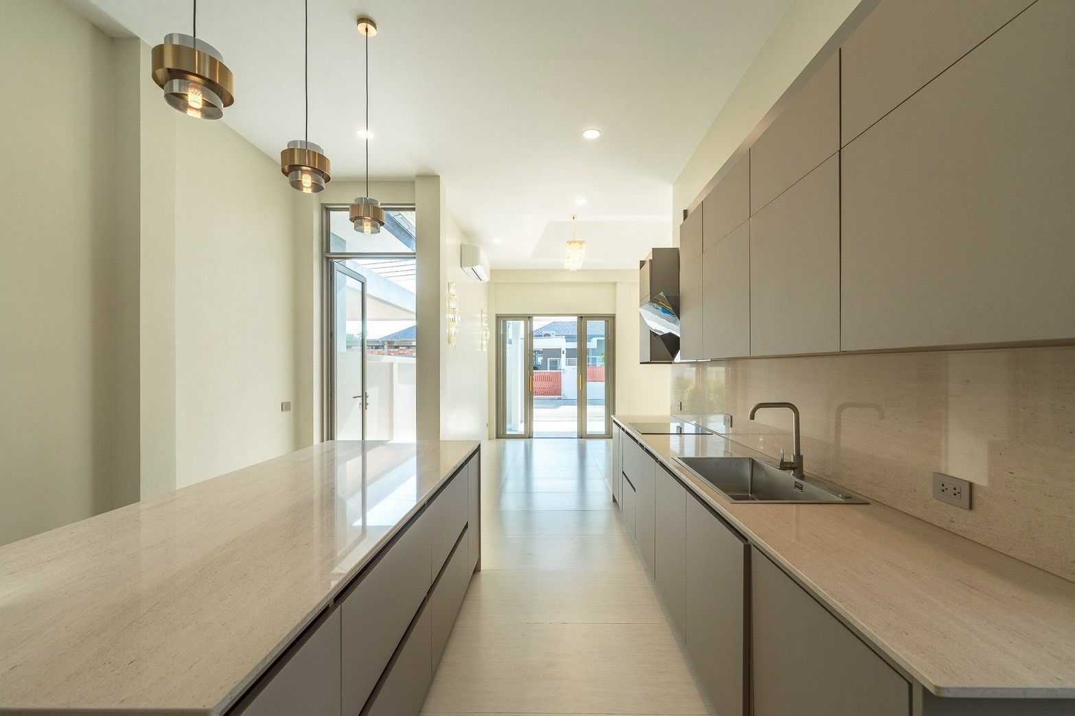 Set on a 324 sq.m land plot with a total living area of 268.7 sq.m, this modern tropical villa is crafted to maximise simplicity, space, and natural light. The open-plan living and dining area extends toward the private 11-metre swimming pool, creating a harmonious connection between indoor comfort and outdoor relaxation. Large sliding glass doors, high ceilings, and two outdoor terraces enhance ventilation and support an effortless alfresco lifestyle. A spacious European kitchen provides a functional centre for cooking and entertaining, while covered parking for two cars adds daily practicality.