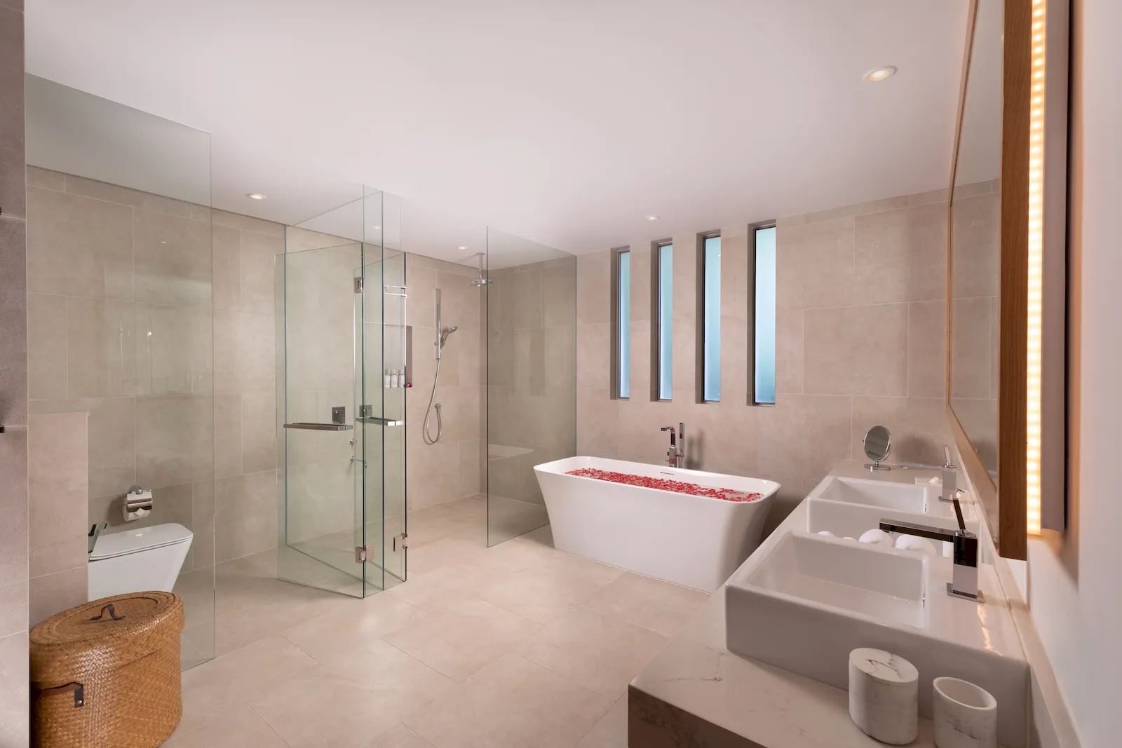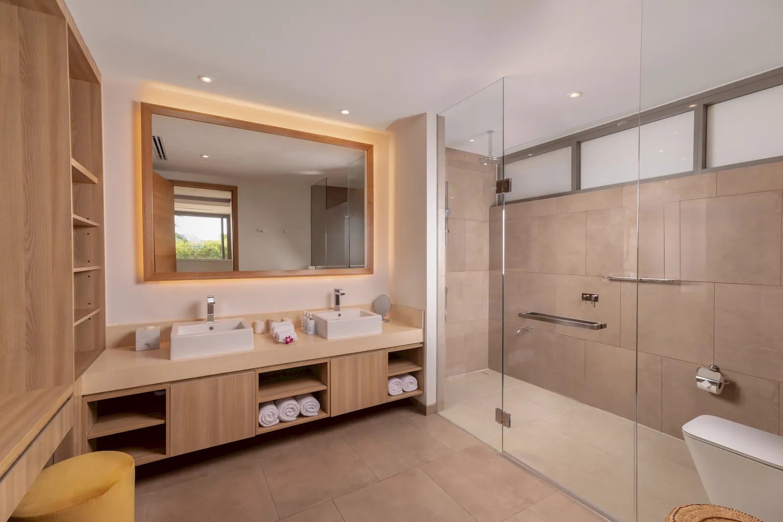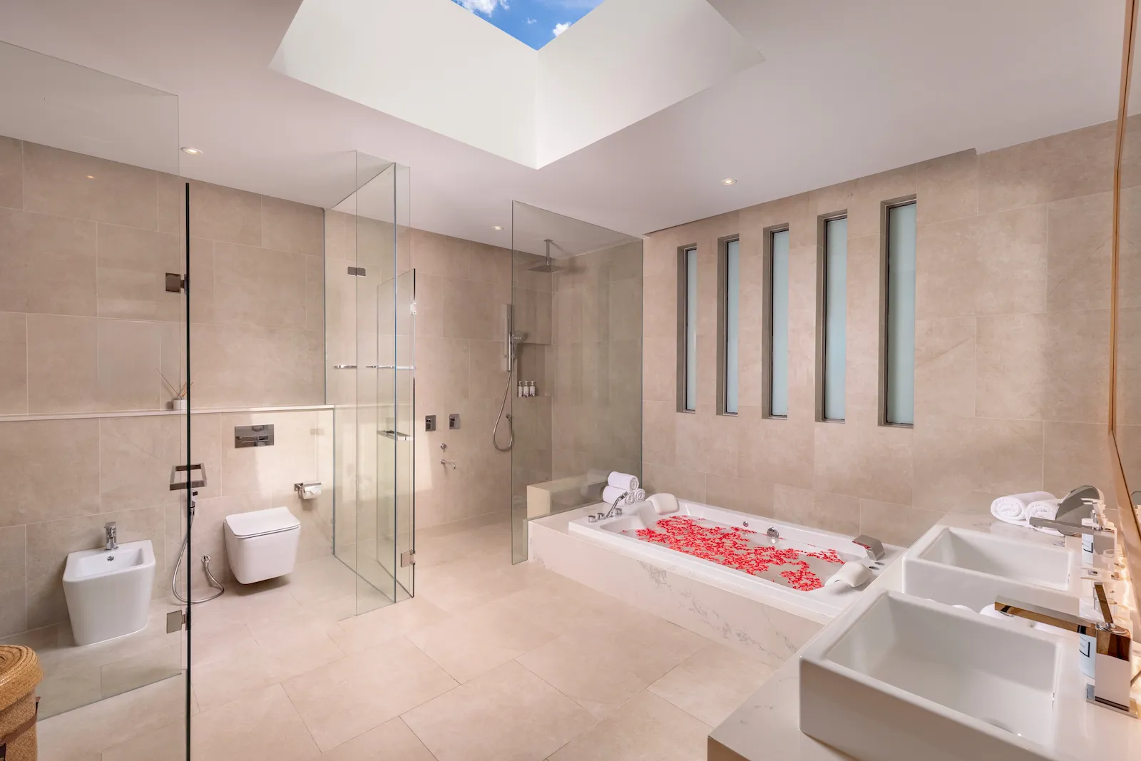 The villa’s contemporary styling showcases natural textures, warm earth tones, and expansive glass walls that frame sweeping ocean vistas. The centrepiece is a 20-meter saltwater infinity pool that stretches toward the horizon, complemented by a separate children’s pool for younger guests. Indoors, an open-plan living and dining space features floor-to-ceiling glass doors opening onto the panoramic pool terrace, supported by a fully equipped modern kitchen and versatile lounge spaces. Generously appointed bedrooms offer private balconies or terraces, spa-style bathrooms, and premium furnishings that enhance the serene coastal atmosphere.