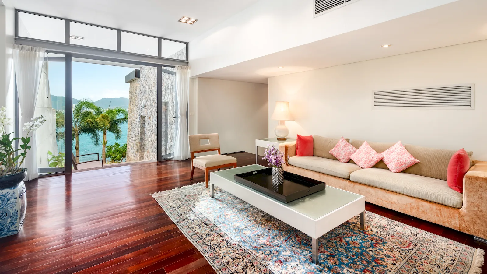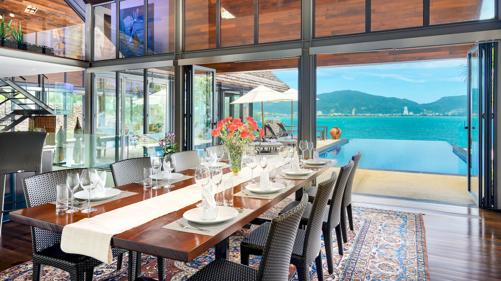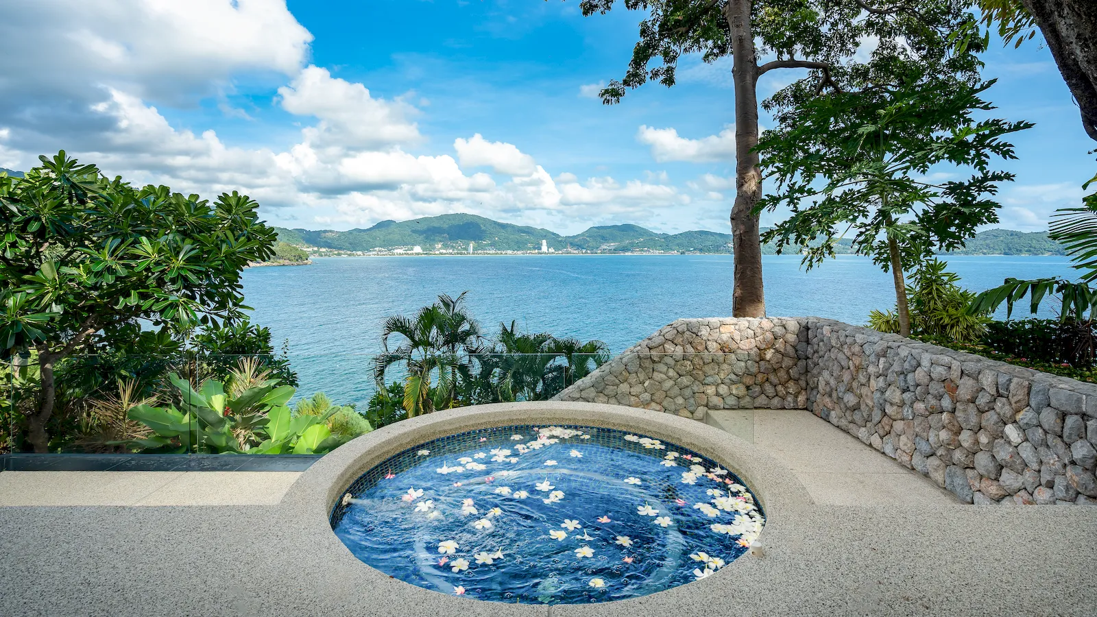 Designed to elevate everyday living, the villa includes a steam room, sauna, multi-level terraces, and an expansive outdoor dining space ideal for sunset gatherings. A large pool deck, landscaped garden paths, and cove-side seating areas create serene outdoor experiences, while an elevator connecting the main floors provides convenience for guests of all ages. Supported by a professional staff team—including a private chef, housekeeping, concierge service, and complimentary shuttle—the property delivers a seamless luxury villa Phuket experience with strong appeal for premium holiday rentals and multi-generational travel.