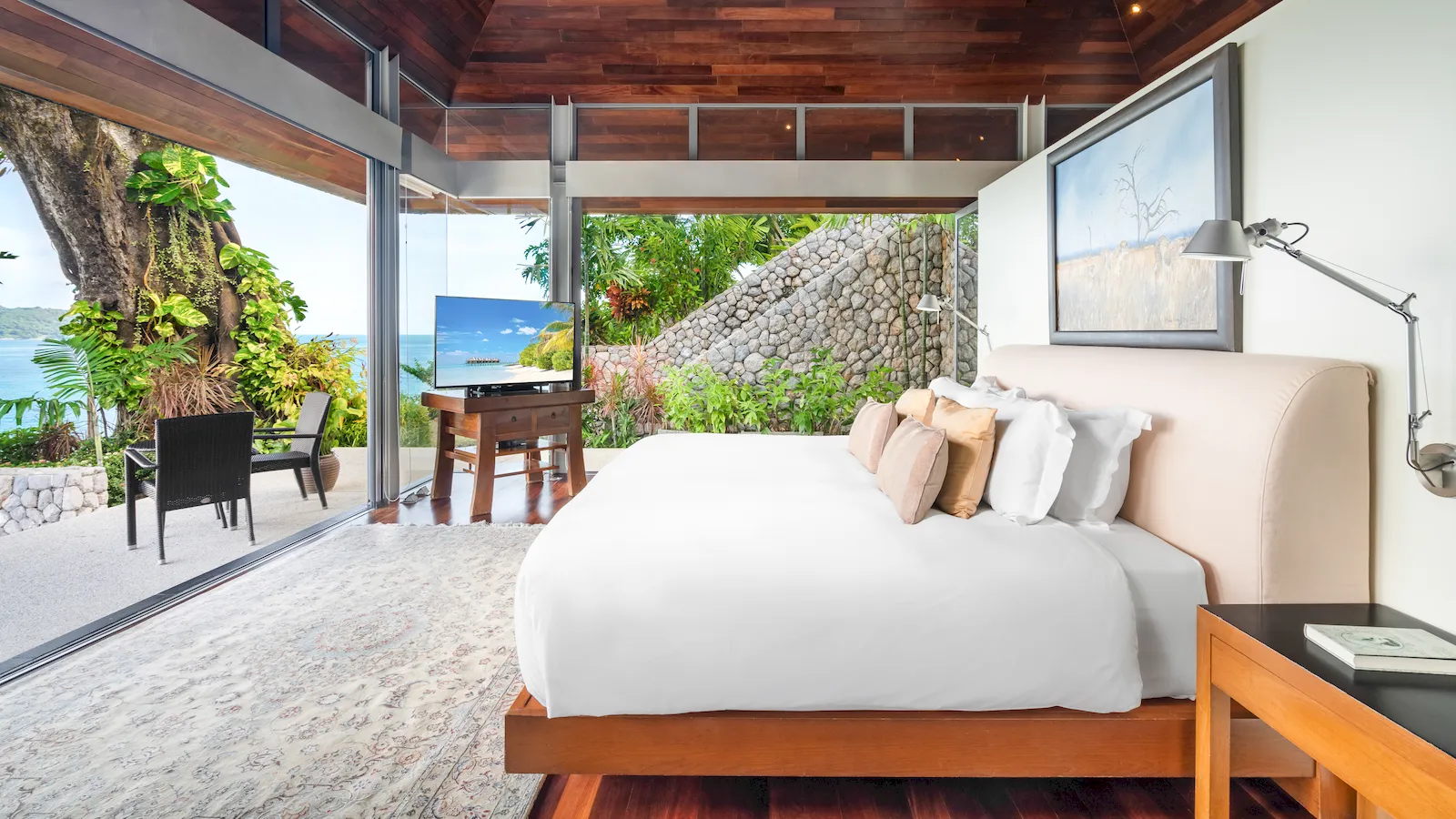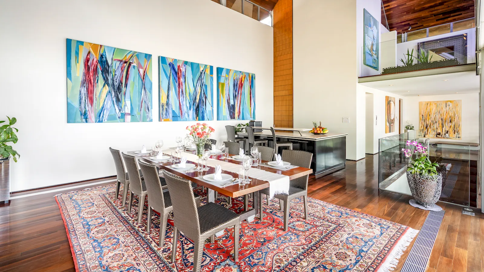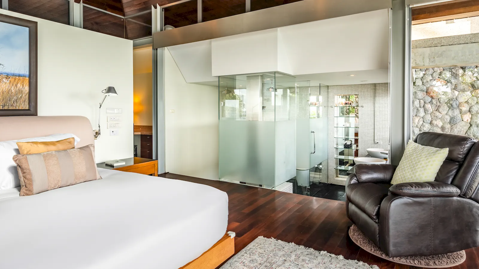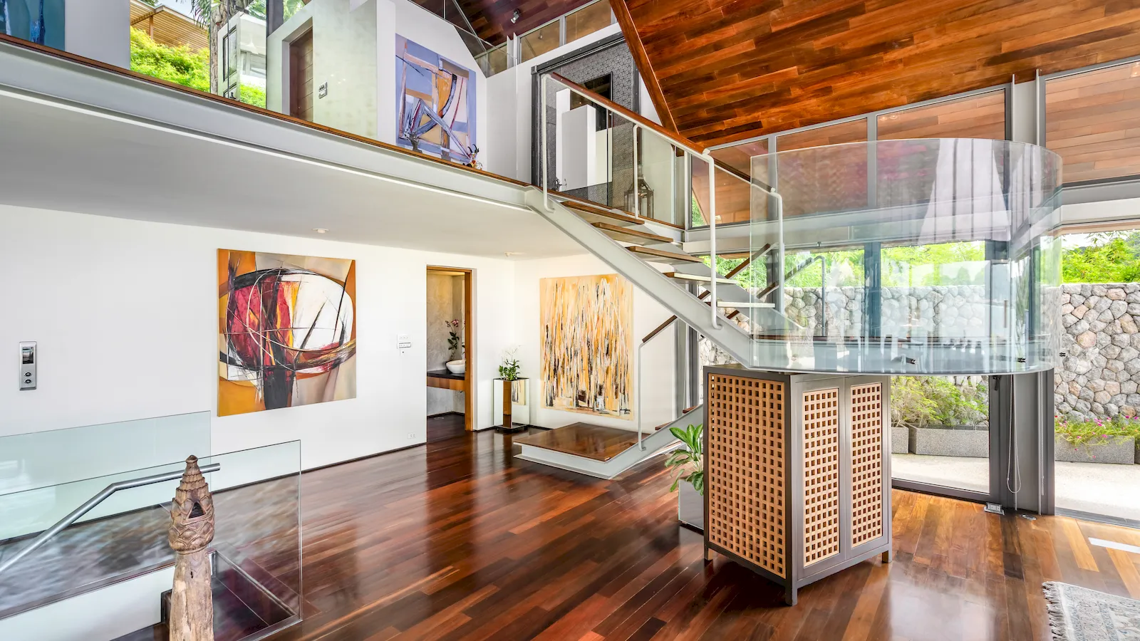 A dramatic entry staircase and glass-lined atrium create an immediate sense of openness, while floor-to-ceiling panels connect the indoor spaces to a panoramic 12-meter saltwater infinity pool. The villa offers five beautifully appointed king-bed suites across multiple levels, including a master suite with private terrace, jacuzzi, walk-in closet, and ocean views. Connecting bedroom configurations make the layout ideal for families, while elegant shared areas—including a vaulted living room, dining atrium, and peaceful library—enhance the sense of comfort and calm.