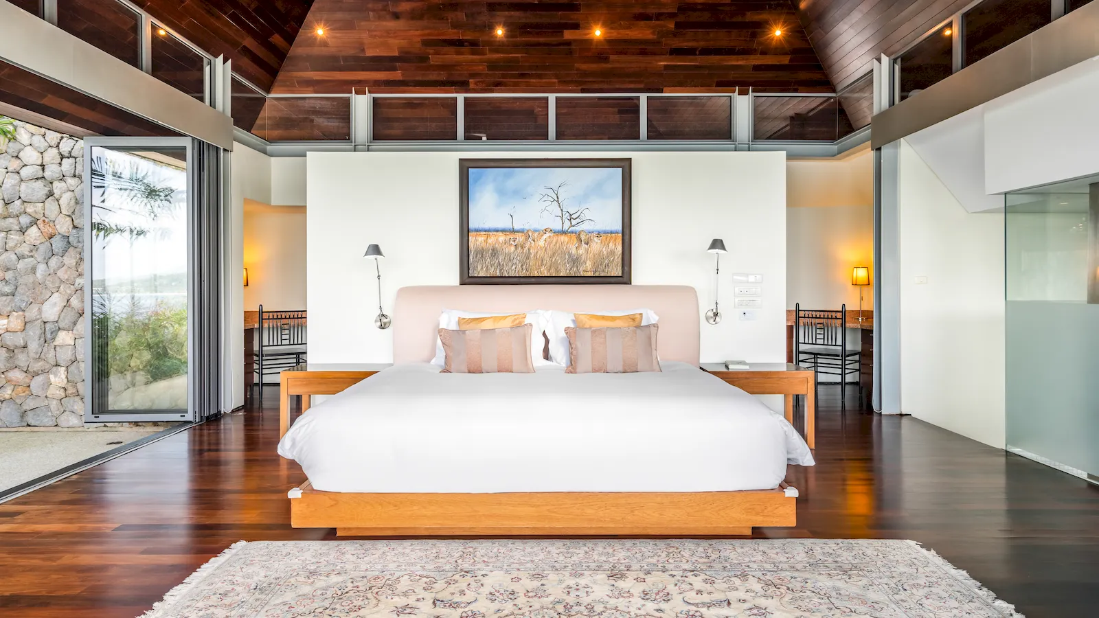 Starting from 41,000 THB per night, this striking contemporary villa occupies a dramatic headland along Phuket’s west coast, offering uninterrupted ocean views and a serene hillside atmosphere. Designed with Asian-inspired sophistication and expansive glass architecture, the residence captures sweeping panoramas of Naka Lay Bay through soaring ceilings, open-plan living spaces, and wrap-around terraces that flow naturally toward the sea.