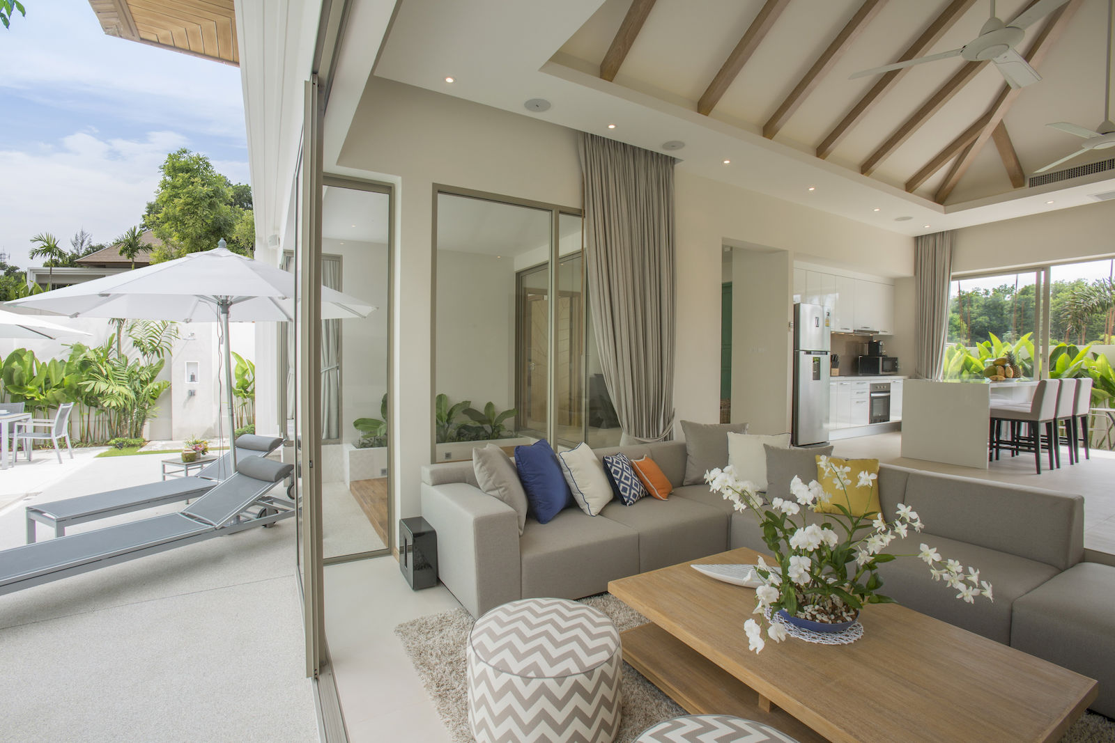 The villa features an open-plan living and dining area, fully equipped kitchen, three spacious bedrooms with modern bathrooms, and direct access to the outdoor pool deck. Large windows and sliding doors enhance natural light and airflow, while the landscaped garden provides a tranquil backdrop for relaxation and entertaining.