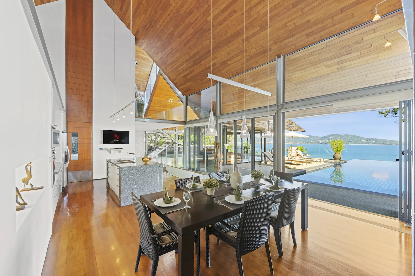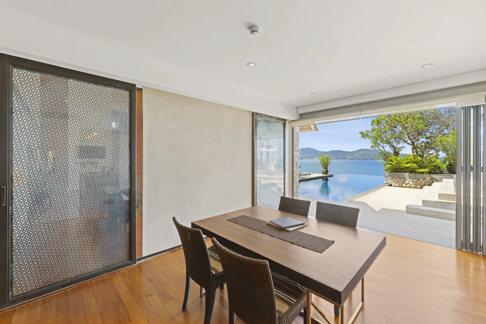 The villa features contemporary tropical minimalism with a warm aesthetic defined by natural textures, stone surfaces, and light wood flooring. A bold staircase leads into a dramatic double-height atrium framed by floor-to-ceiling glass panels, capturing uninterrupted vistas of Patong Bay and the surrounding tropical greenery. Generous terraces wrap around the main living areas, connecting directly to outdoor lounges, dining spaces, and a 14-meter saltwater infinity pool that extends toward the horizon. Thoughtfully designed communal spaces, including indoor and outdoor dining areas, a modern US kitchen, and a dedicated study, ensure a balanced mix of elegance and everyday comfort.
