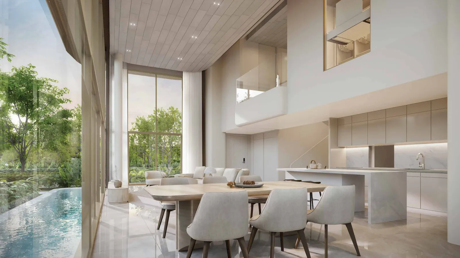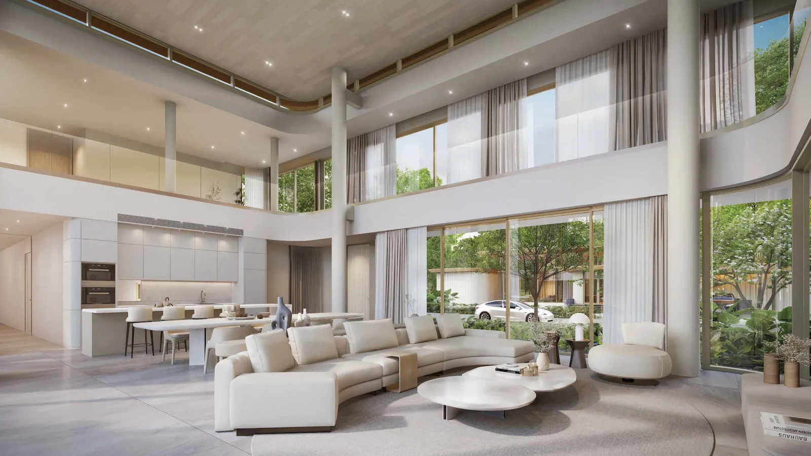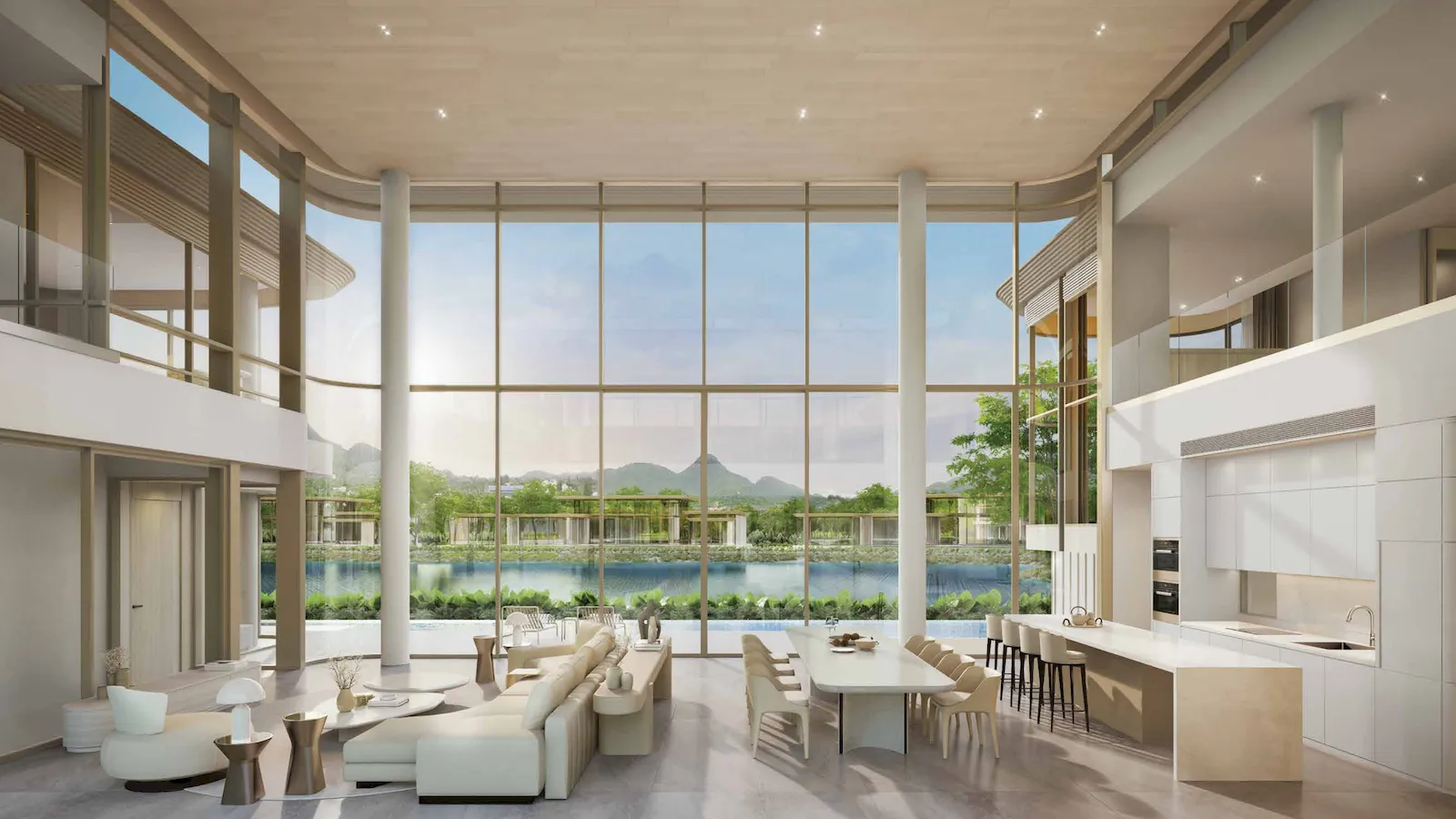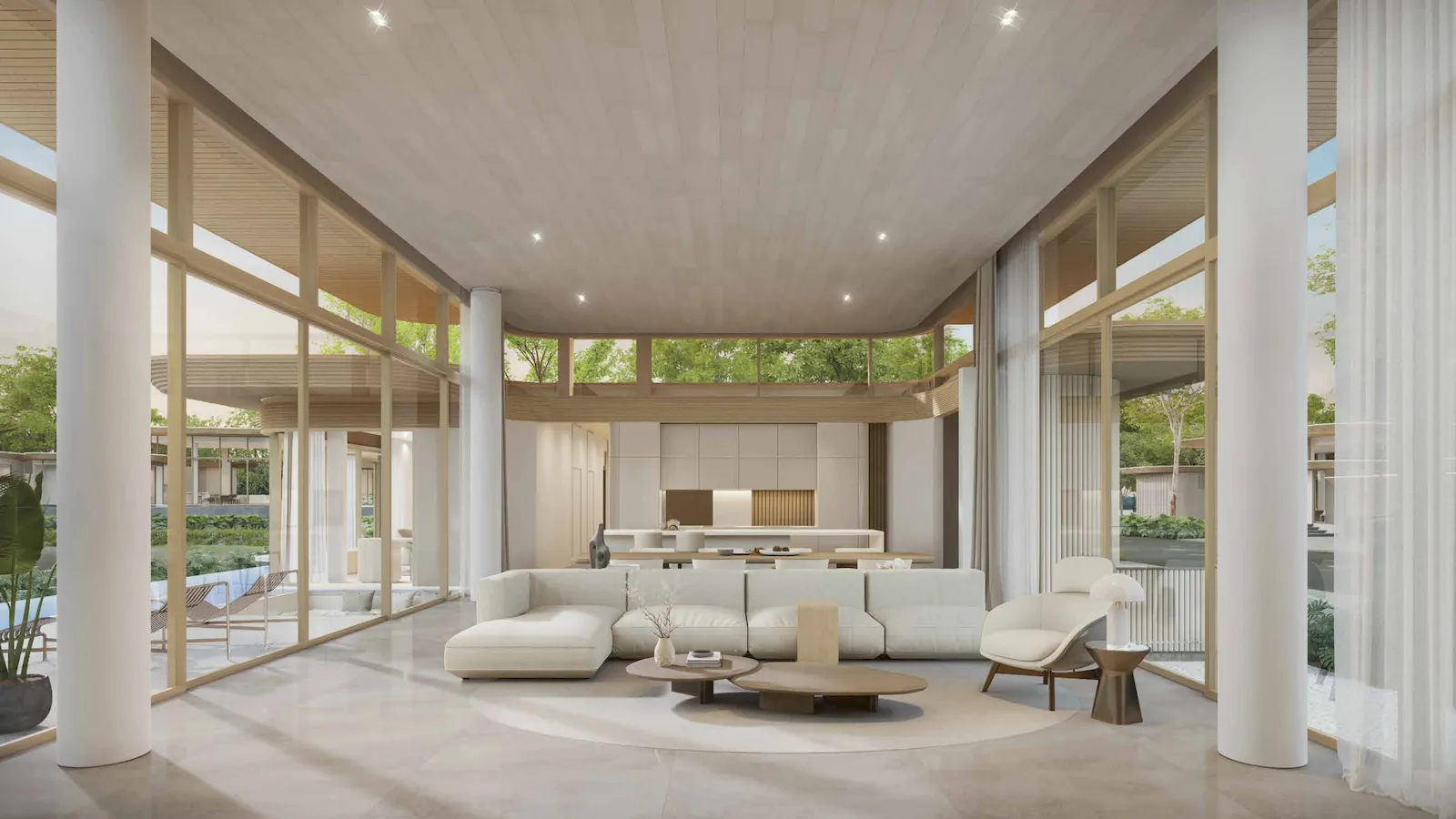 Interiors balance contemporary lines with natural textures, including stone accents, sustainable wood detailing, imported tilework, and engineered flooring. Oversized floor-to-ceiling openings enhance ventilation and extend views across gardens and pool areas. Interior customisation is available for buyers seeking tailored finishes.