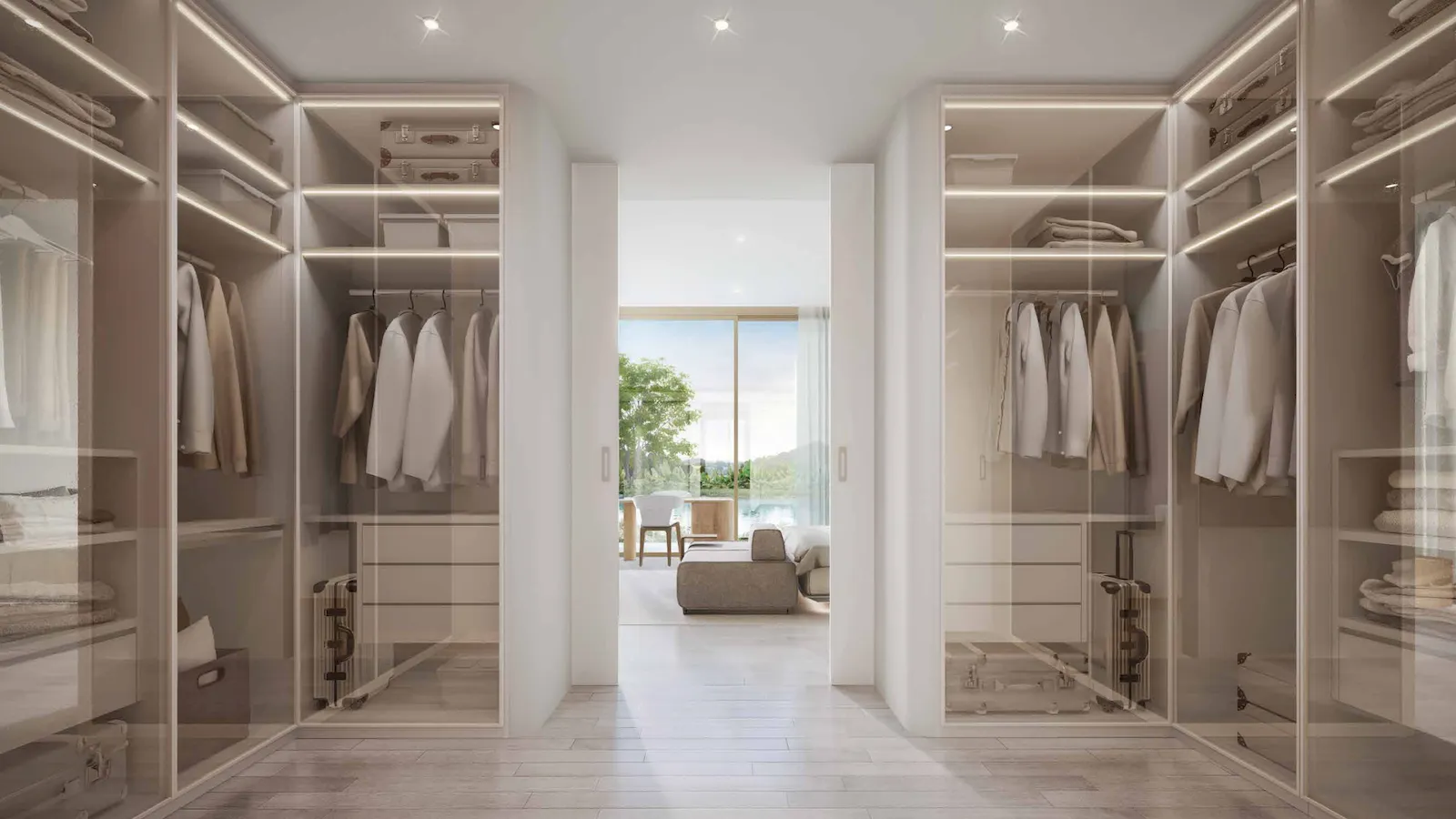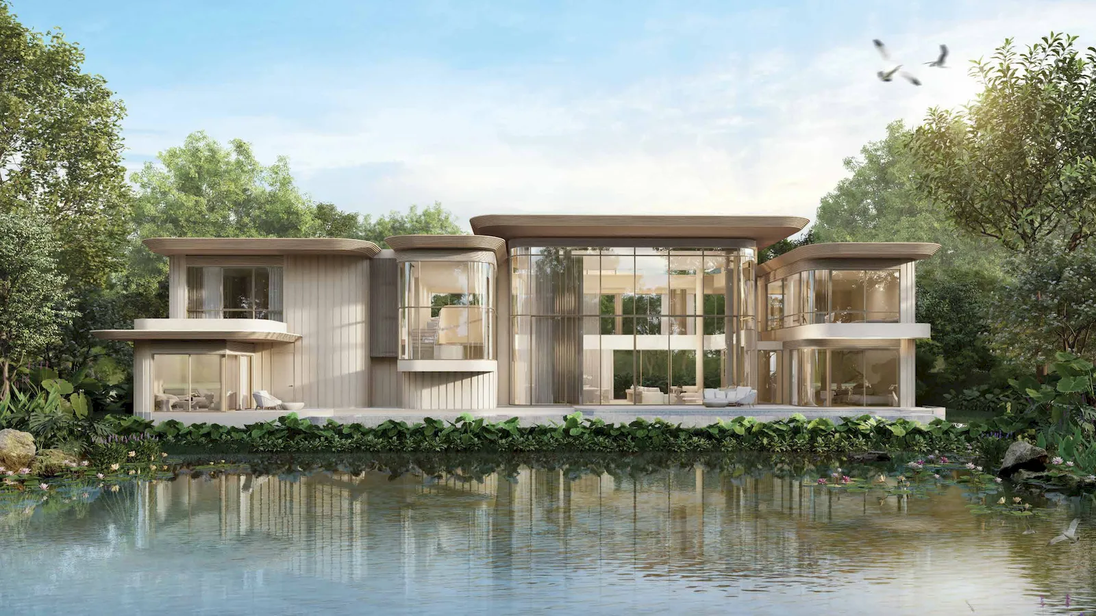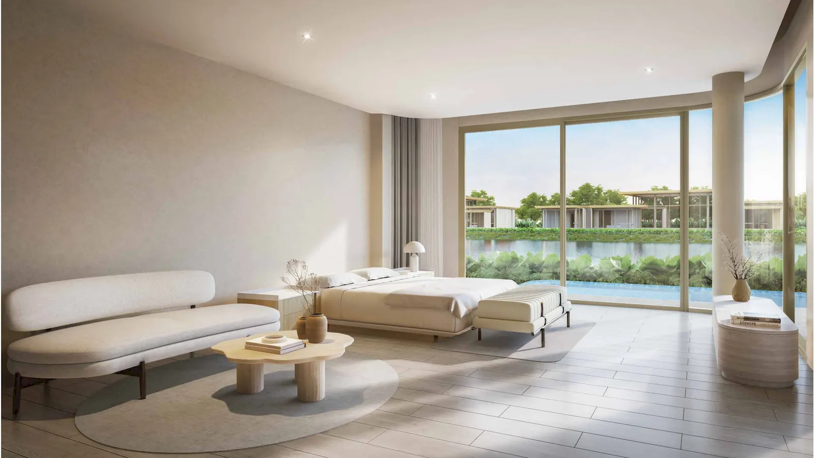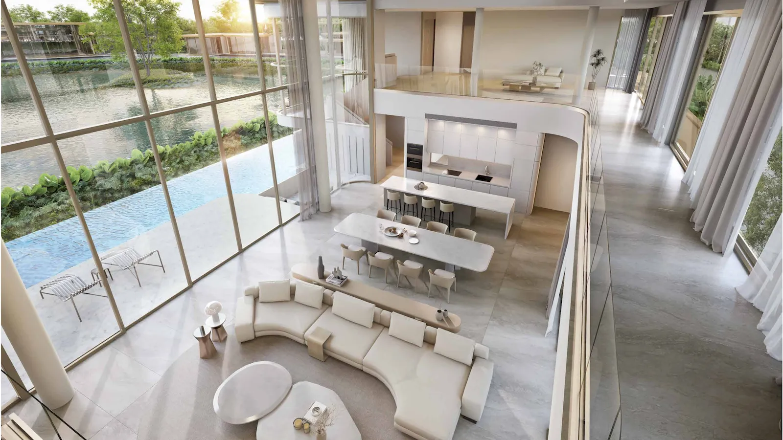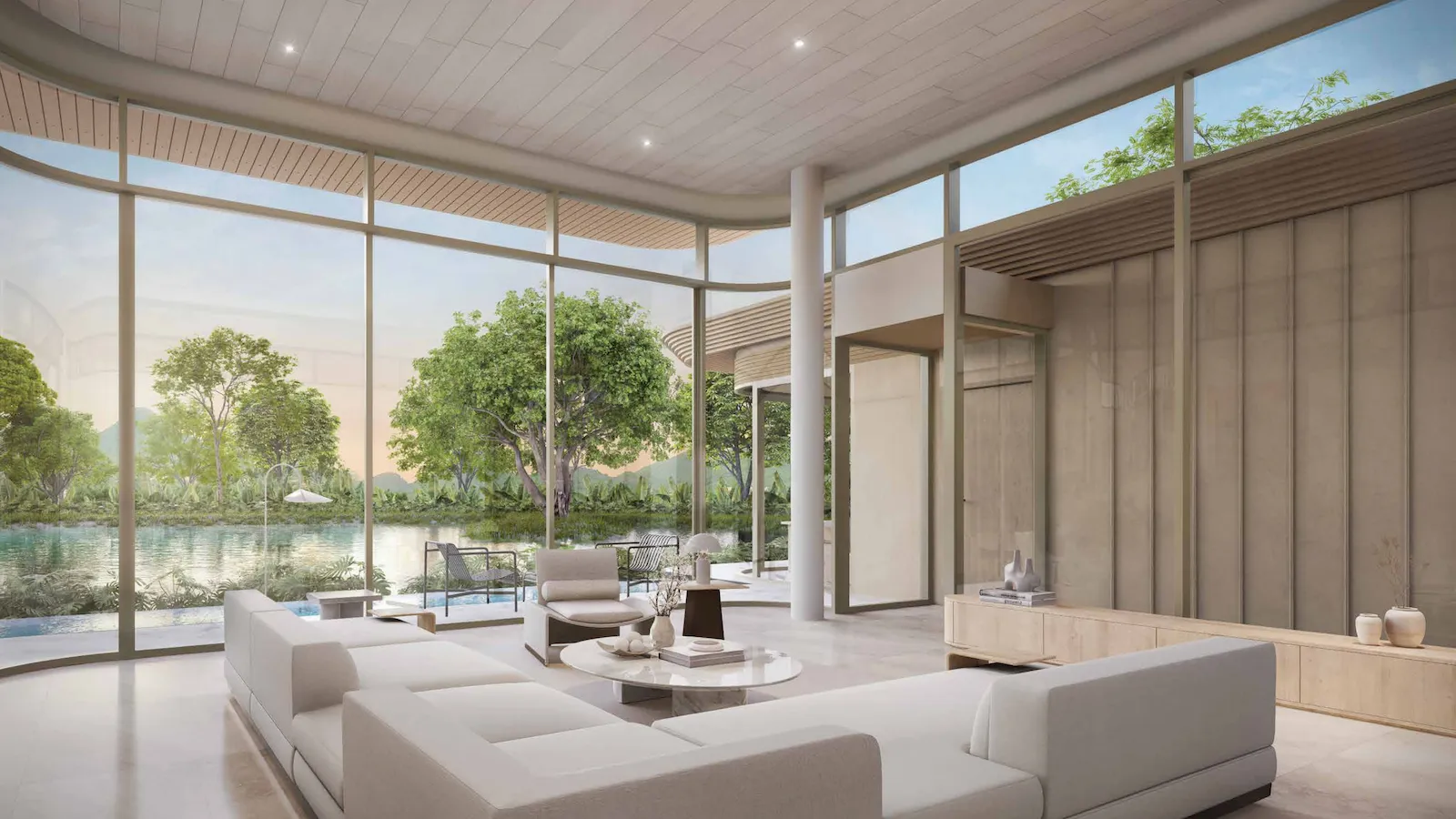 Interiors balance contemporary lines with natural textures, including stone accents, sustainable wood detailing, imported tilework, and engineered flooring. Oversized floor-to-ceiling openings enhance ventilation and extend views across gardens and pool areas. Interior customisation is available for buyers seeking tailored finishes.