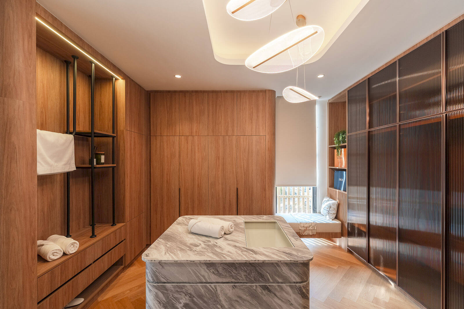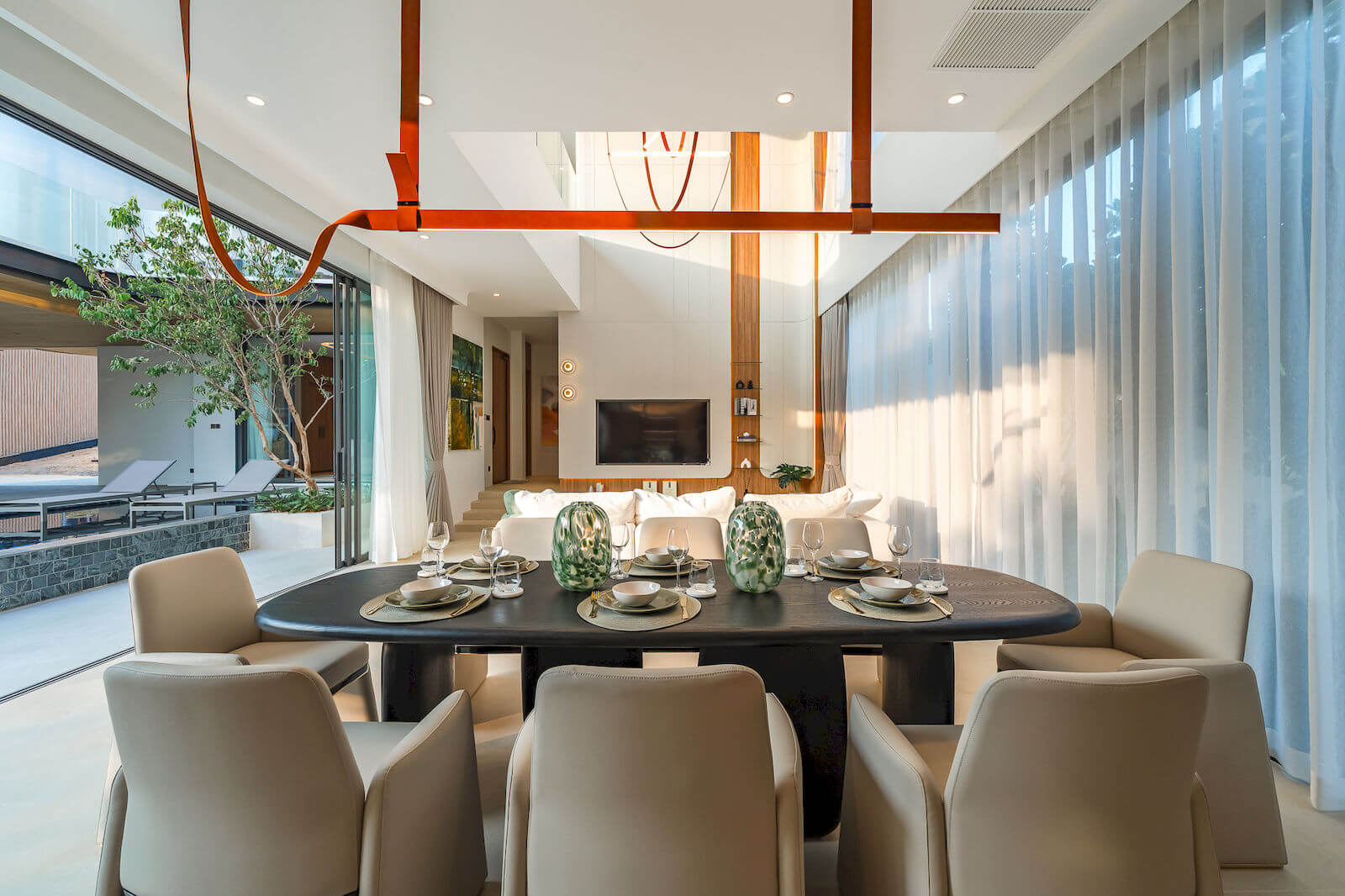 Each villa has been thoughtfully crafted to offer a sophisticated tropical living environment, with high ceilings, expansive glazing, and warm natural textures. Open-plan living and dining areas flow seamlessly toward the pool terrace, where landscaped gardens, a private sala, and generous outdoor seating create an elegant resort-style atmosphere. Interior design elements feature rich wood ceilings, soft ambient lighting, and dramatic dark-and-gold accents, delivering a refined and inviting aesthetic throughout.