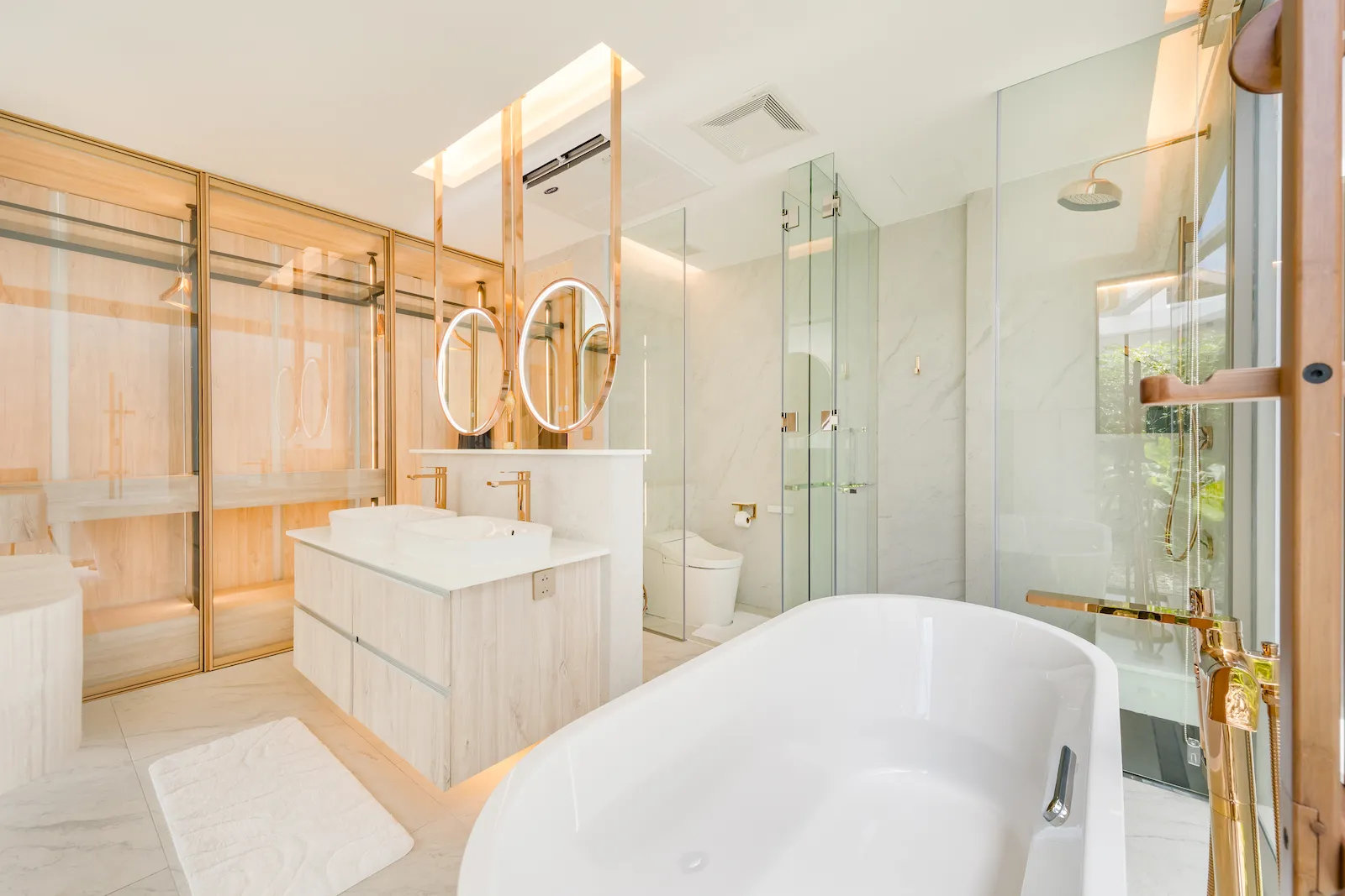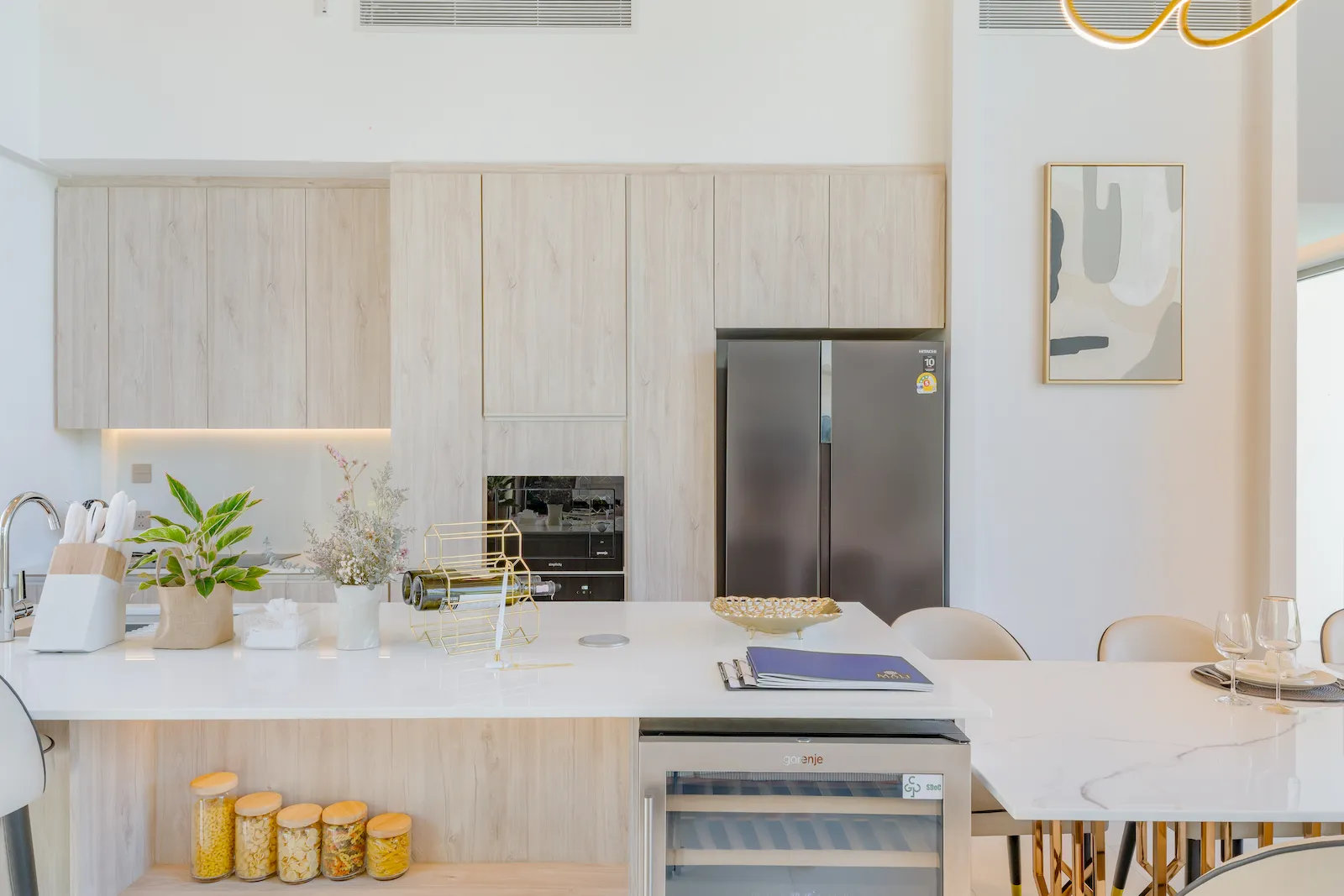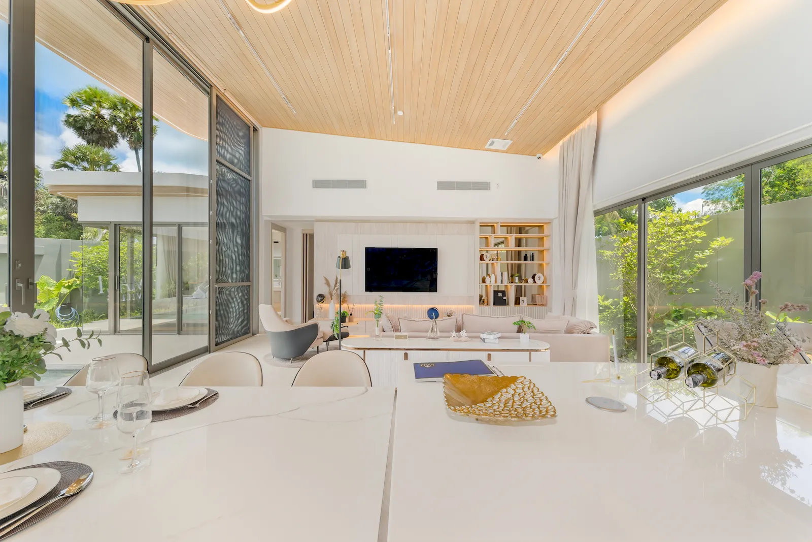 The villa embraces contemporary tropical architecture characterised by clean lines, expansive glazing, and a seamless indoor–outdoor flow. The open-plan living and dining area integrates harmoniously with the kitchen, creating a sophisticated yet functional space for everyday living and entertaining.