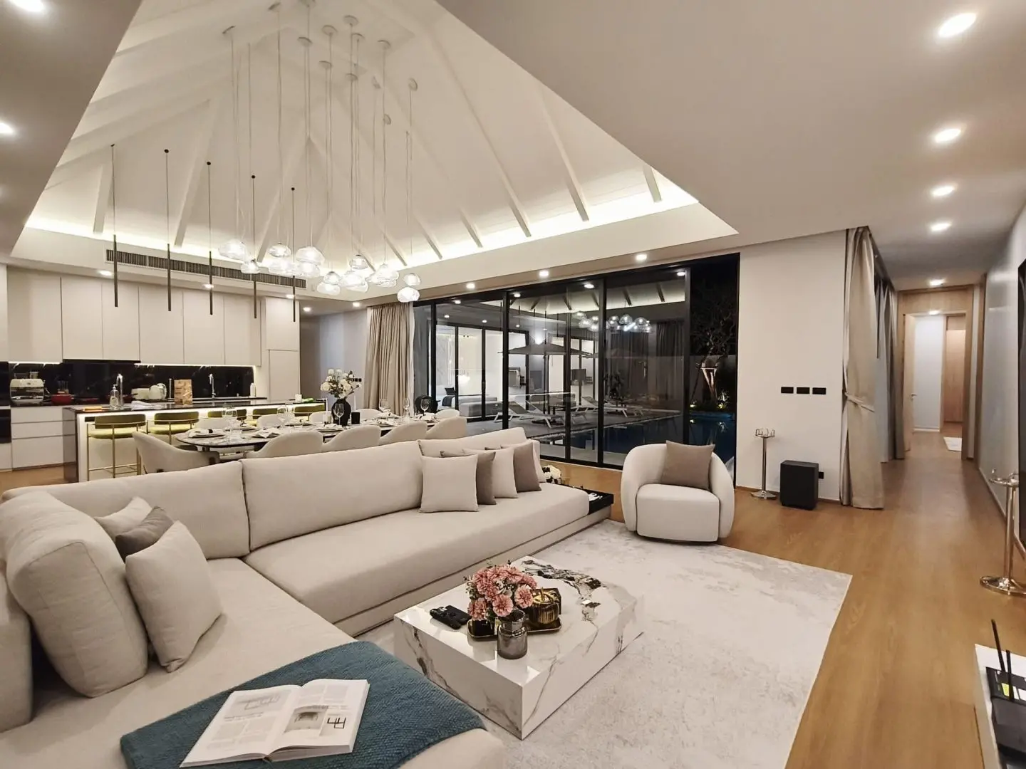 seamless indoor–outdoor flow. High ceilings and large sliding glass doors allow natural light to fill