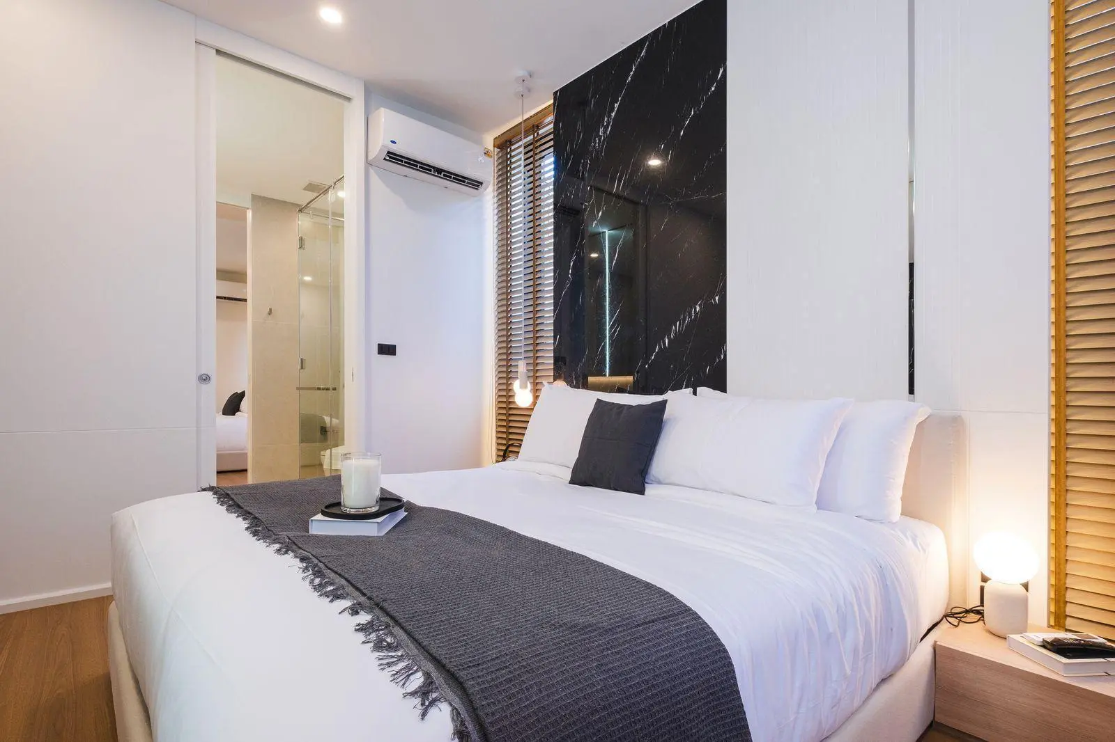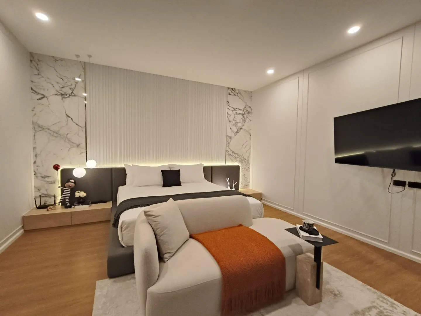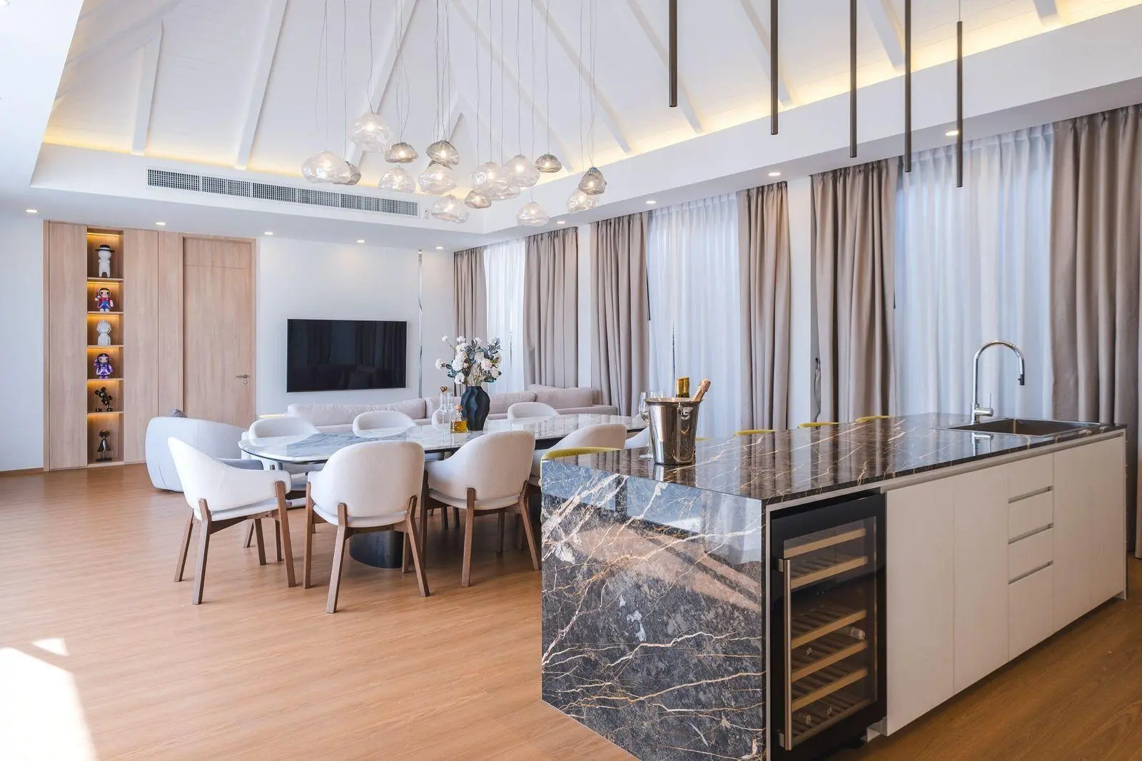 the living spaces, while premium materials, built-in wardrobes, and tastefully designed bathrooms