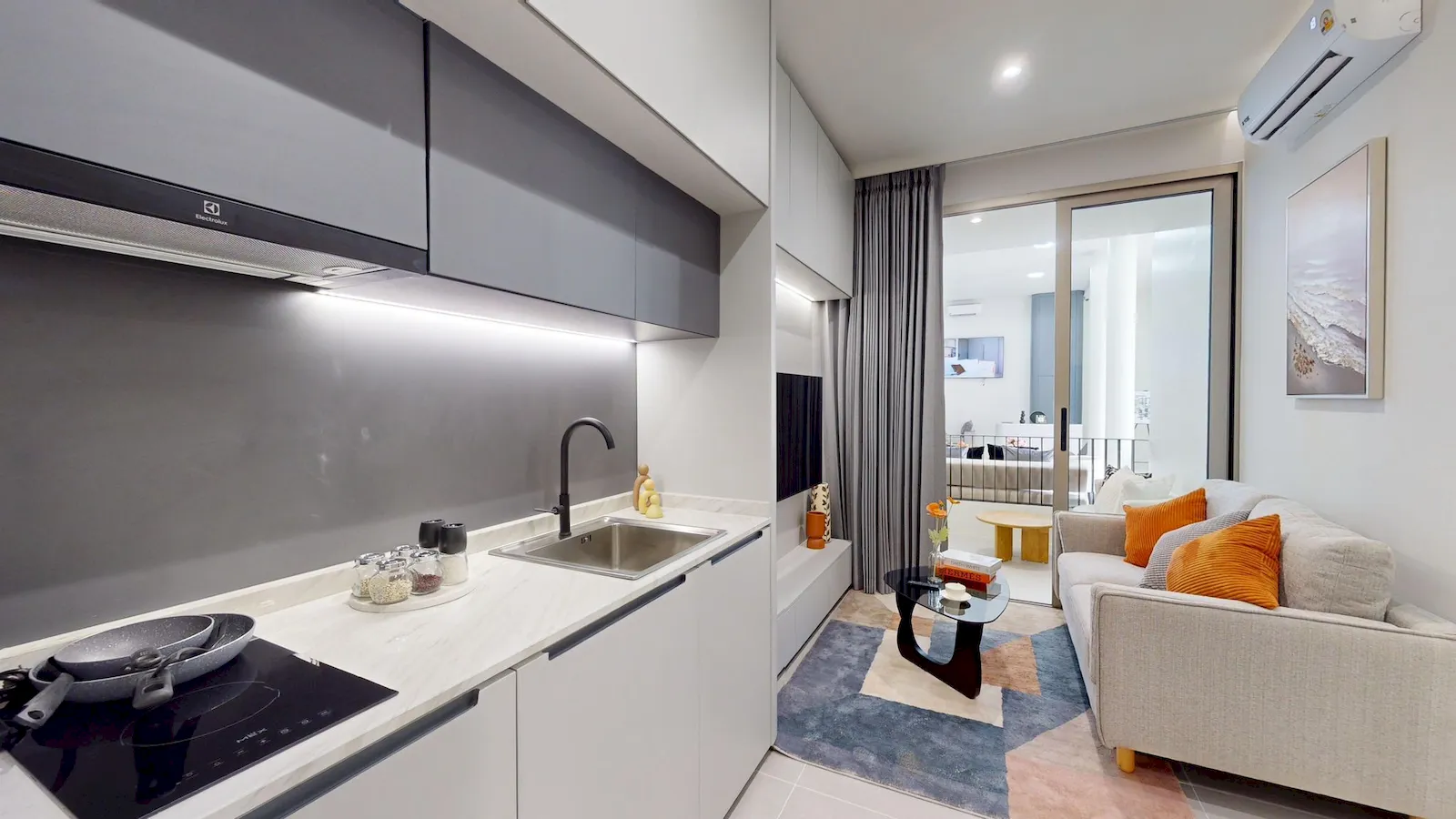 The residence maximises natural light and usability through streamlined spatial planning. A modern kitchenette, comfortable bedroom suite and open living area create a cohesive environment ideal for short stays or full-time urban-coastal living. The design reflects a subtle resort influence, offering both comfort and practicality.