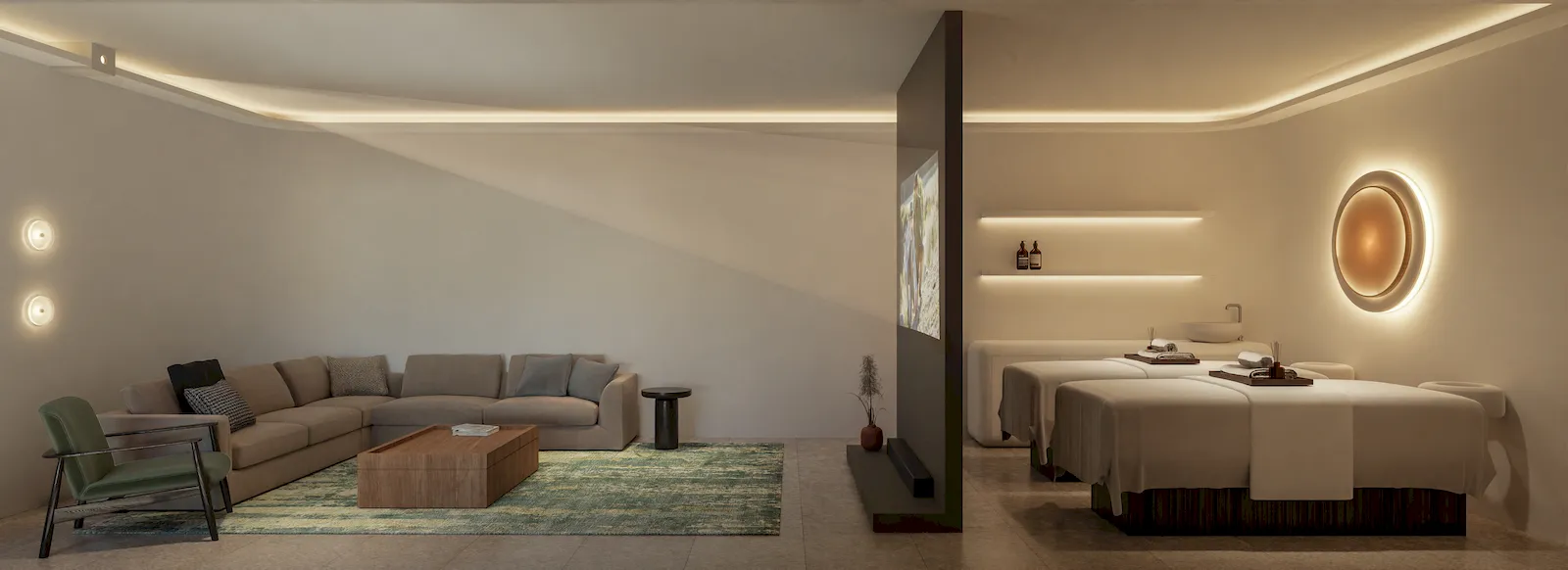 A private swimming pool forms the centrepiece of the outdoor environment, bordered by landscaped gardens and a terrace ideal for quiet relaxation or informal entertaining. The orientation and layout ensure privacy while maintaining a seamless connection to the home’s interior spaces, creating a calm, resort-inspired setting.