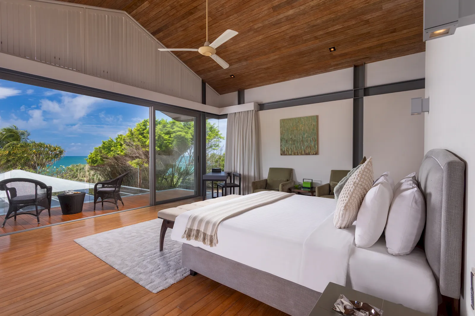 Designed to harmonise with its pristine beachfront surroundings, this modern tropical villa features open-plan living and dining areas framed by floor-to-ceiling windows, inviting natural light and uninterrupted ocean vistas into every corner of the home. The 25-metre saltwater infinity pool extends visually toward the horizon, complemented by a poolside deck, alfresco dining spaces, and manicured beachfront lawns ideal for relaxation and entertaining. Across six stylish bedrooms—ranging from ocean-view master suites to versatile guest rooms—the layout prioritises privacy, comfort, and functionality for families and groups. Contemporary interiors, curated furnishings, and a refined palette of natural materials contribute to a serene and cohesive aesthetic.