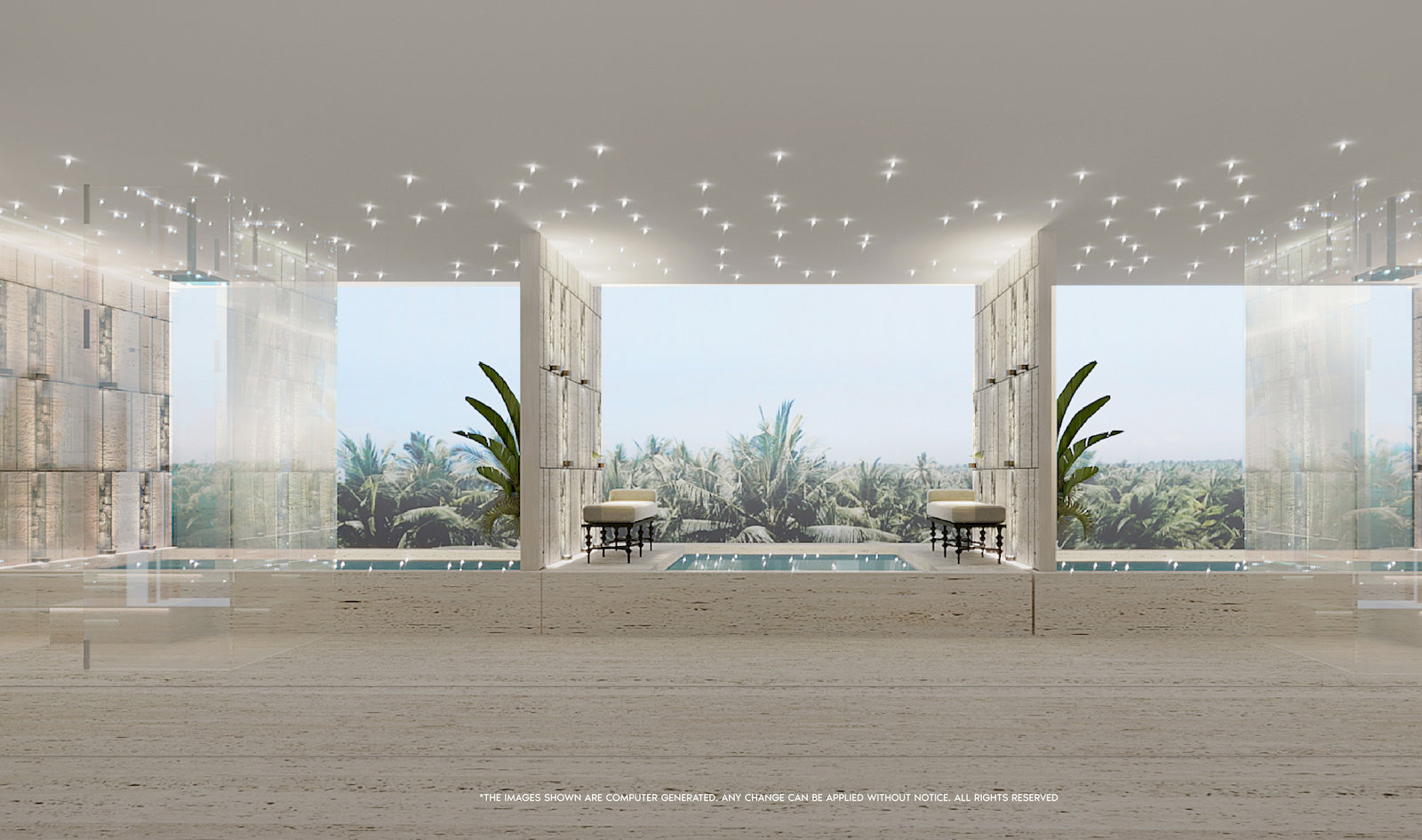 Multiple water environments—including a beach pool, lap pool, hydrotherapy pool, and elevated sky pool—create varied leisure zones throughout the property. A rooftop onsen and jacuzzi introduce a wellness-focused retreat, while panoramic sky terraces, sky lounges, and a sky bar provide sophisticated social settings above the landscaped grounds.
