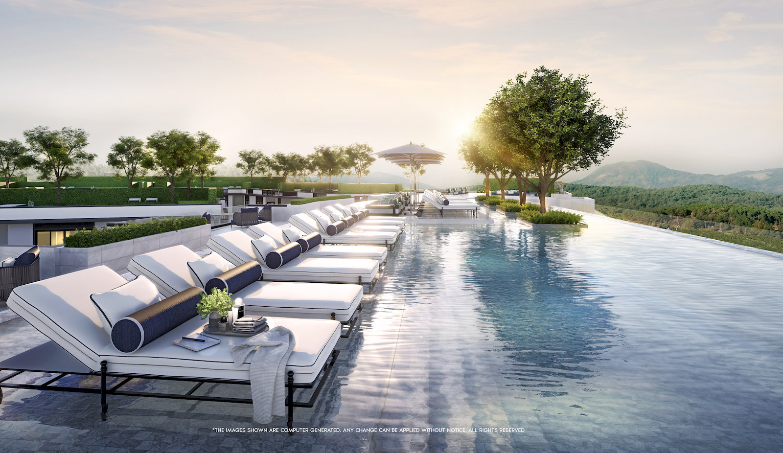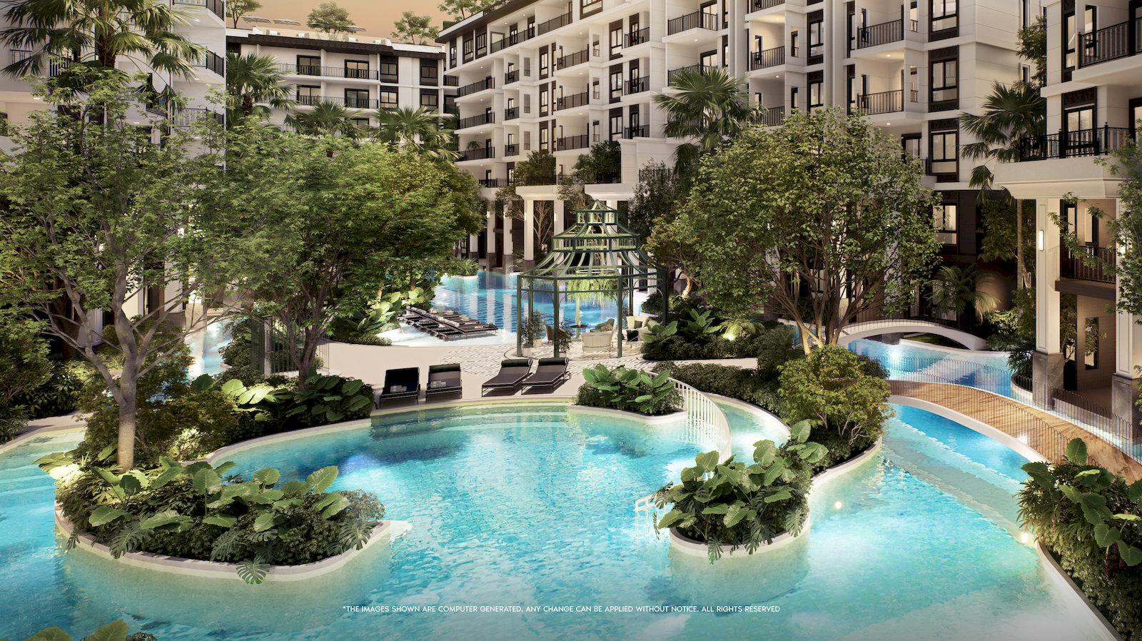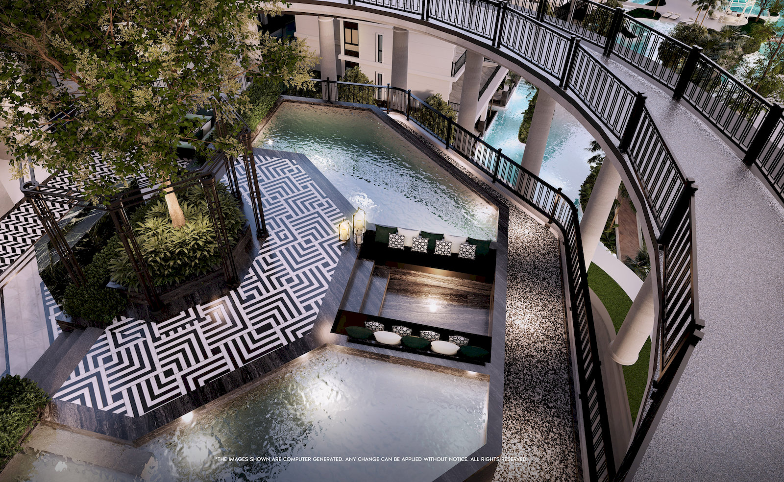 The outdoor environment is conceived as a layered resort sanctuary, elevating daily living beyond the conventional condominium experience.