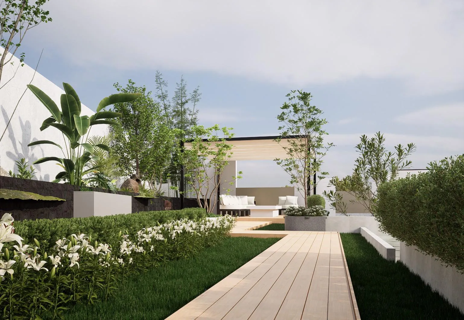 A private 3 × 8 metre swimming pool serves as the centrepiece of the outdoor area, complemented by a sun deck and landscaped tropical garden. Covered parking for two cars adds convenience, while the outdoor lounge areas provide a relaxed setting for family time or quiet retreat.