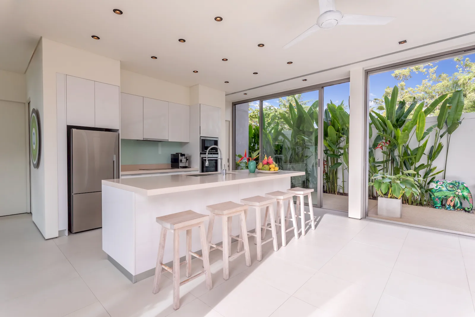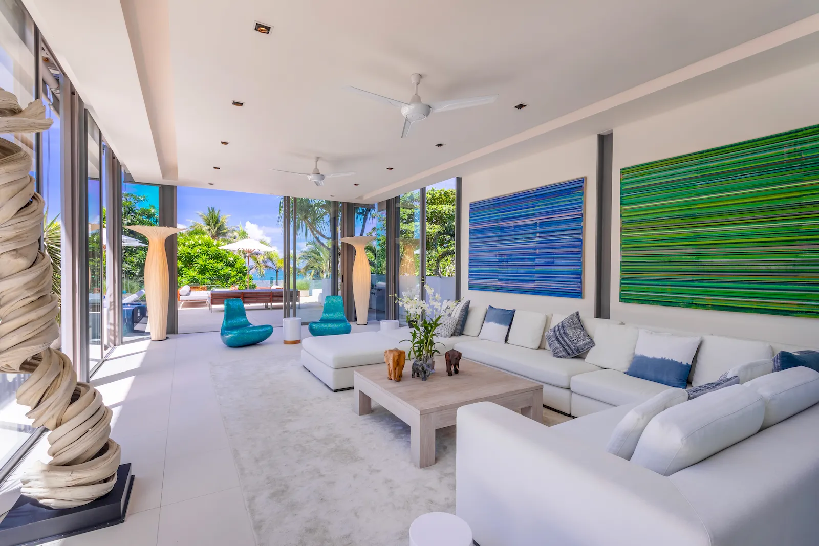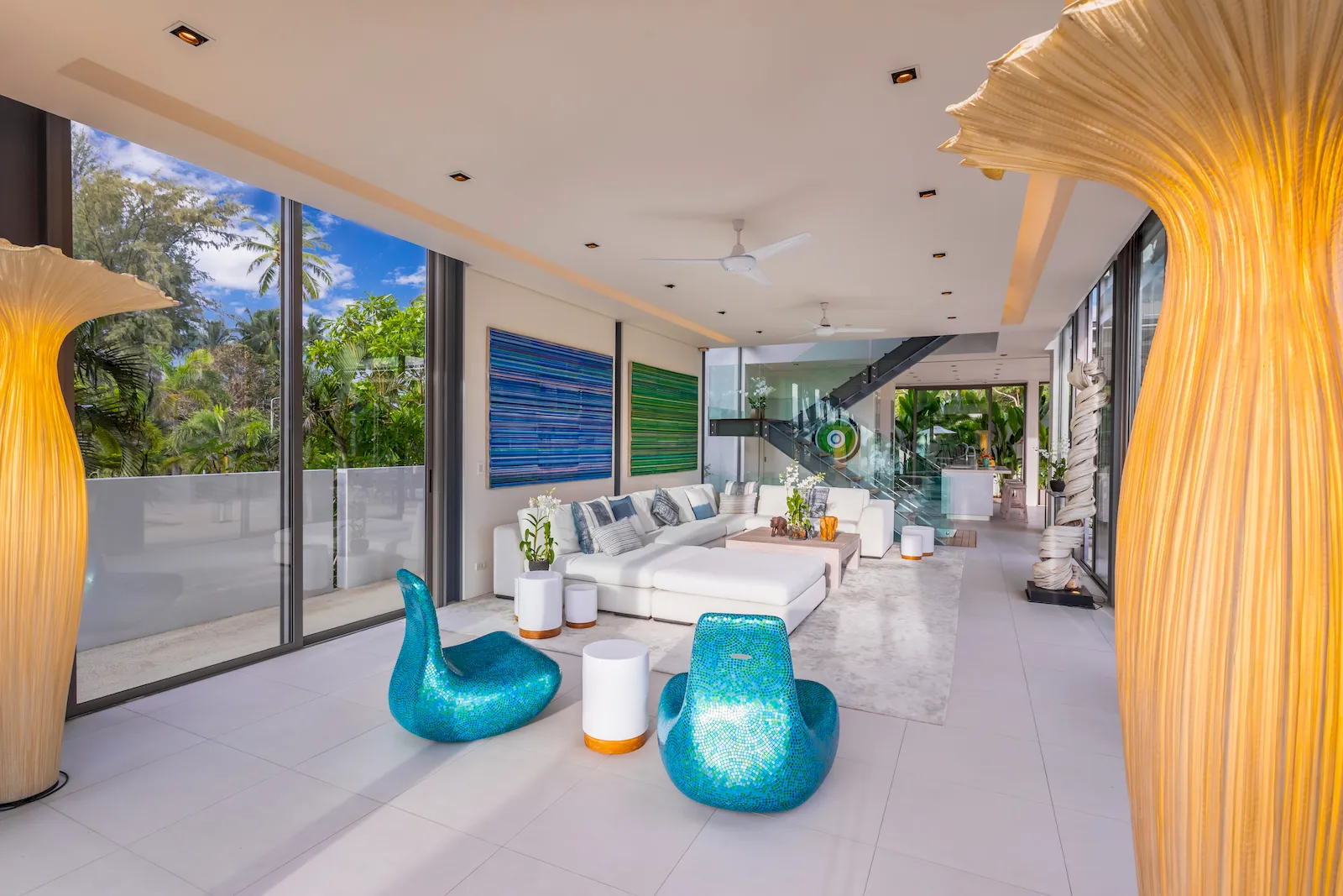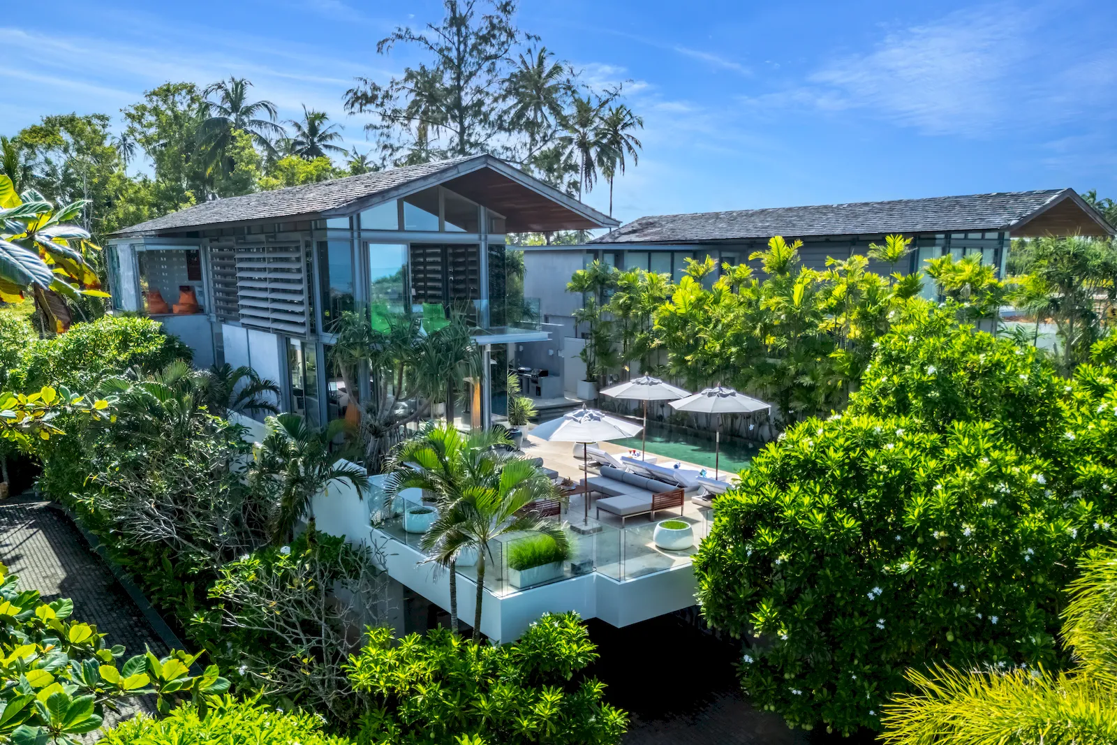 A signature 25-meter saltwater infinity pool forms the centrepiece of the property, extending toward the horizon with uninterrupted views of the Andaman Sea. Sun terraces, shaded lounges, and an alfresco dining pavilion complement the villa’s bright, open-plan interiors. Floor-to-ceiling glass walls connect indoor living spaces to the beachfront lawn and outdoor lounging areas, creating a seamless transition between architecture and nature. The interiors feature clean modern lines, warm timber accents, and contemporary furnishing throughout.