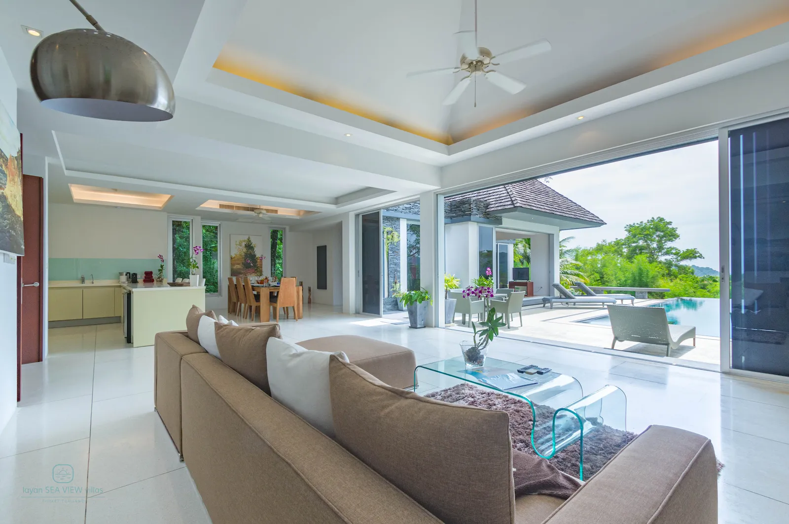 The main living level features a bright open-plan lounge and dining area that flows toward the infinity pool terrace, creating a seamless indoor–outdoor experience. A fully equipped modern Western kitchen supports both everyday living and entertaining.