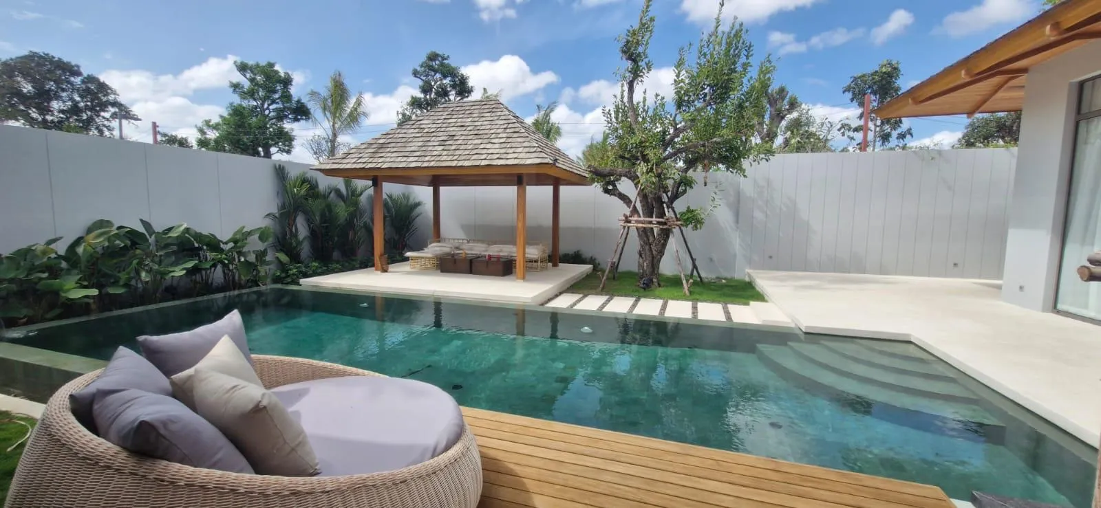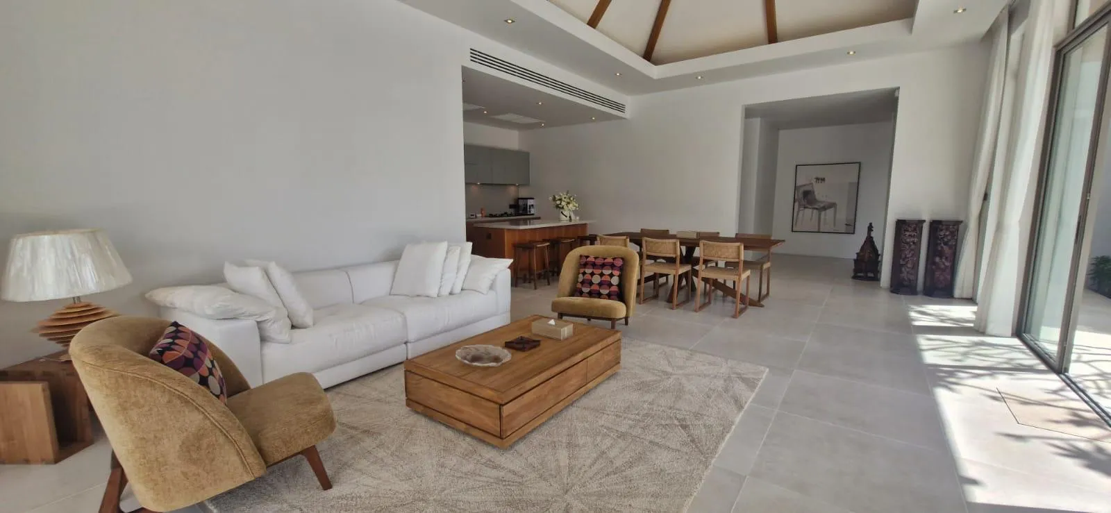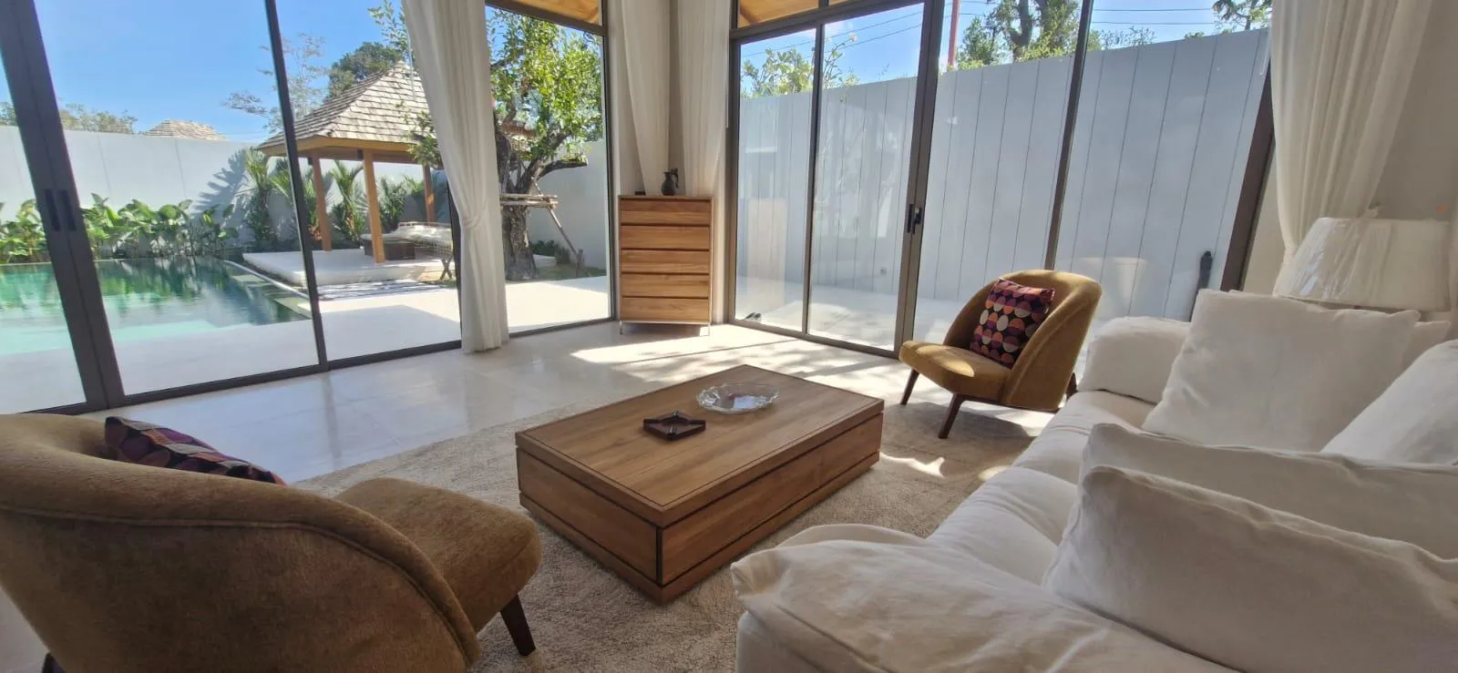 The villa features an airy open-plan living space, a modern kitchen, three en-suite bedrooms, and seamless connections to outdoor lounging and pool areas. The thoughtful layout enhances comfort, privacy, and modern tropical living.