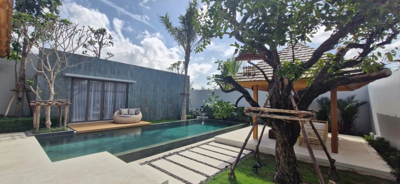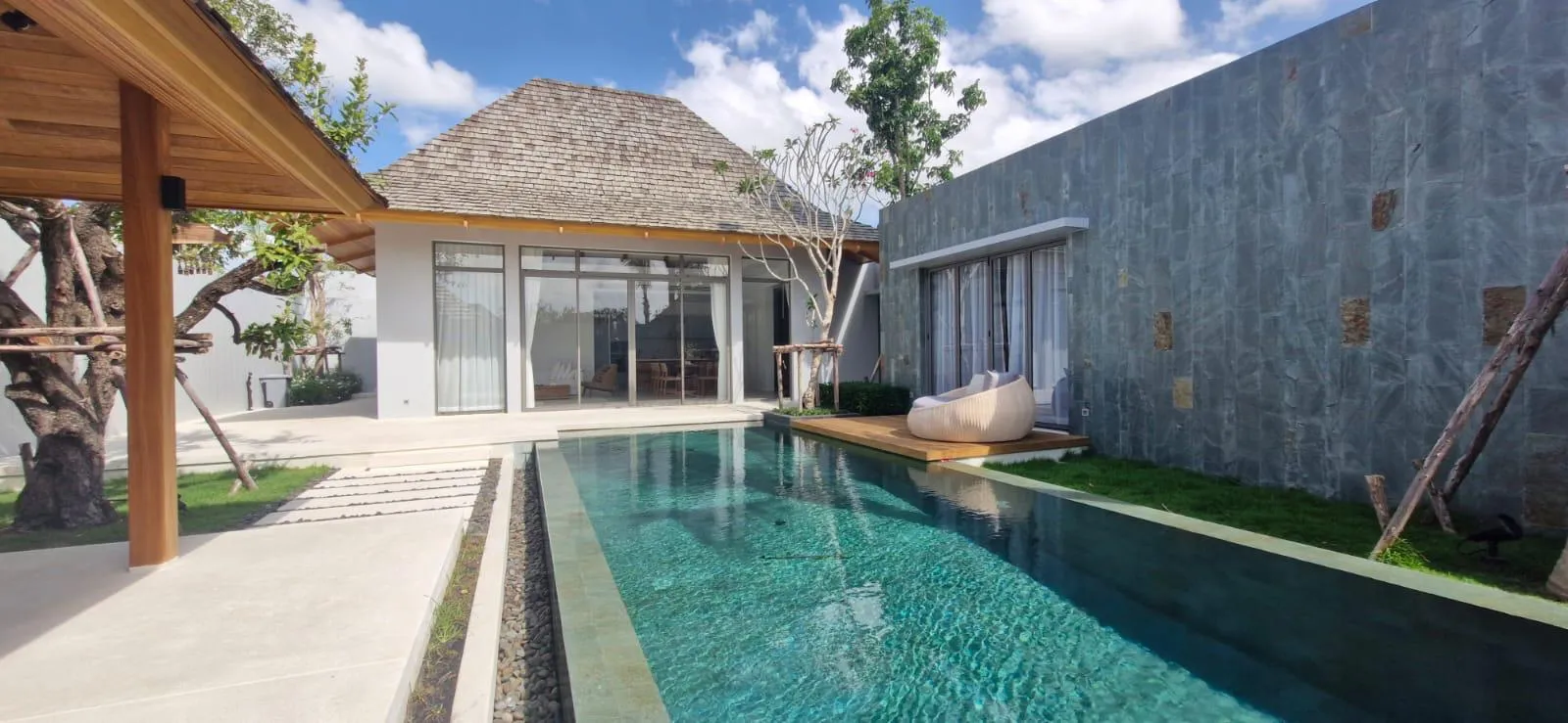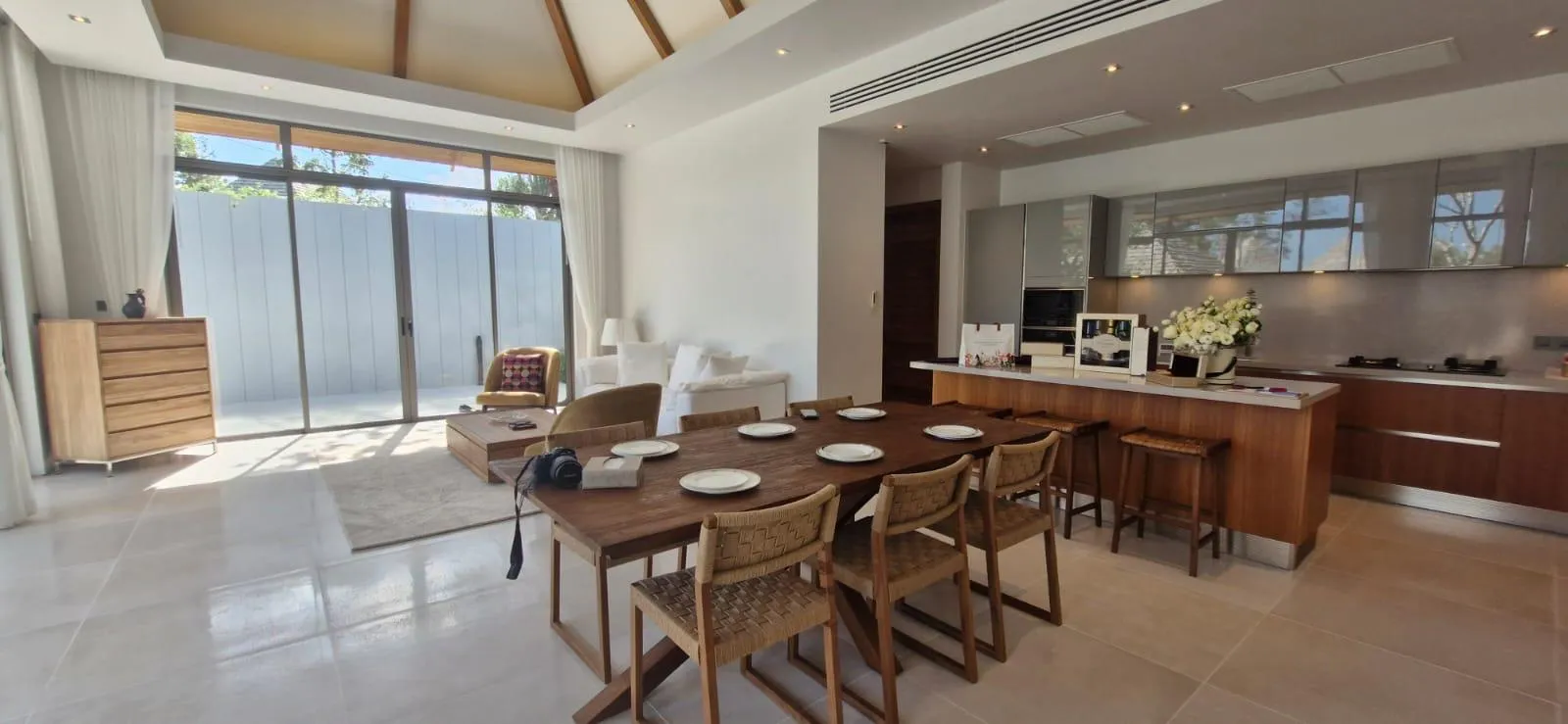 Crafted with a contemporary tropical aesthetic, the villa showcases bright open-plan living and dining spaces that open directly onto the terrace, landscaped garden, and private pool. High ceilings and full-length glass enhance natural light throughout the home, creating a sense of openness and tranquility. The fully equipped Western kitchen features quality appliances and practical workspace, while all three bedrooms include en-suite bathrooms for optimal privacy. The master suite offers direct pool access and a serene setting perfect for relaxation.