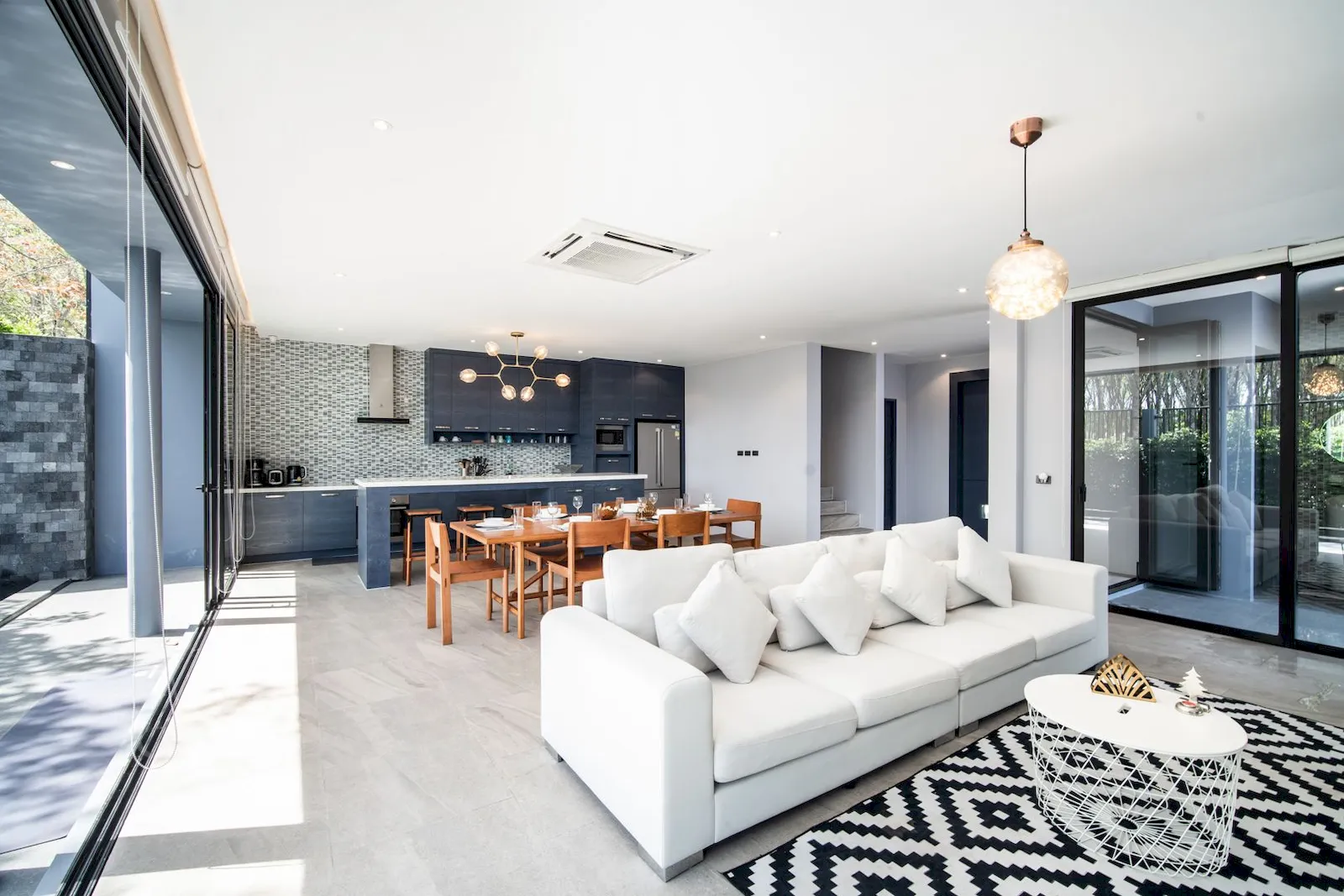 The villa showcases a modern tropical design with bright open-plan living spaces, high-quality materials, and well-zoned rooms for family comfort. Two distinct living areas offer flexibility for entertainment, relaxation, or multi-generational living, while the fully equipped modern kitchen supports both casual and formal dining needs.