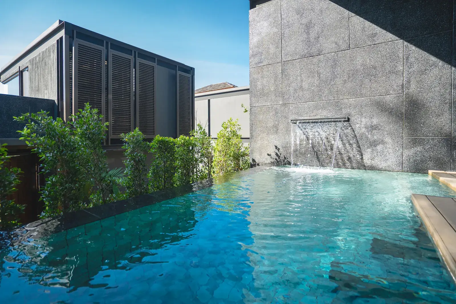 The layout features an open-plan living and dining area connected to a fully fitted Western kitchen, creating a bright central living space with direct access to the pool. The bedroom includes an en-suite bathroom, while an additional guest bathroom enhances convenience for residents and visitors. Clean architectural lines and subtle tropical elements give the villa a calm, contemporary feel.