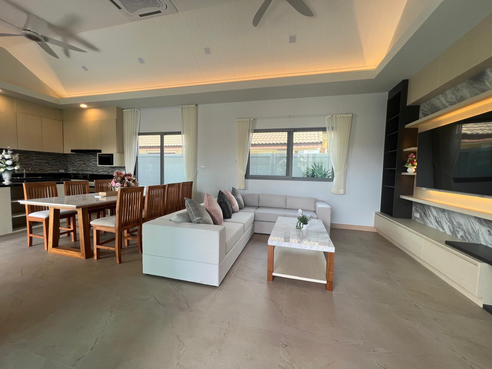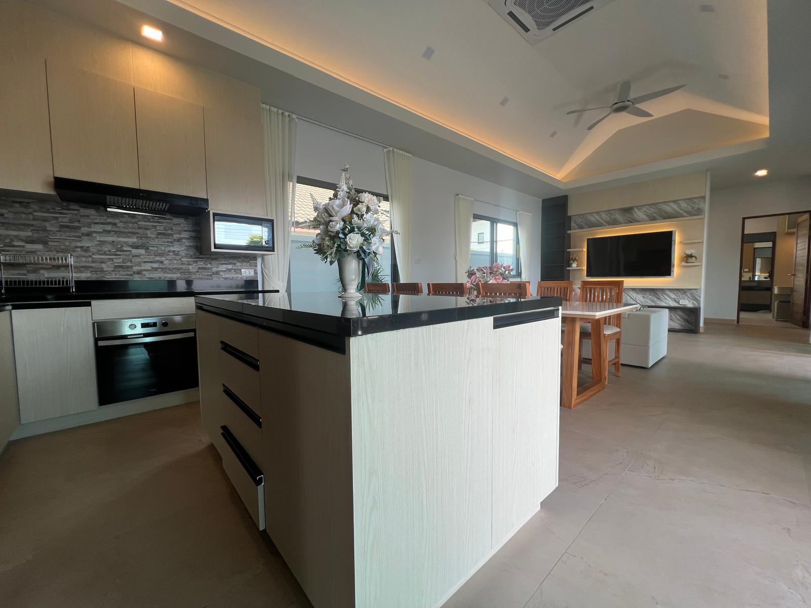 Crafted for elegant island living, the villa features an open-plan layout with a bright living and dining area that flows seamlessly toward the private pool terrace. High ceilings, contemporary finishes, and quality furnishings elevate the home’s modern tropical aesthetic. The fully equipped Western kitchen, five modern bathrooms, and four spacious bedrooms—each thoughtfully designed—create a comfortable and functional environment for families or long-stay residents. A private covered parking area and landscaped outdoor spaces complete the home’s well-balanced layout.