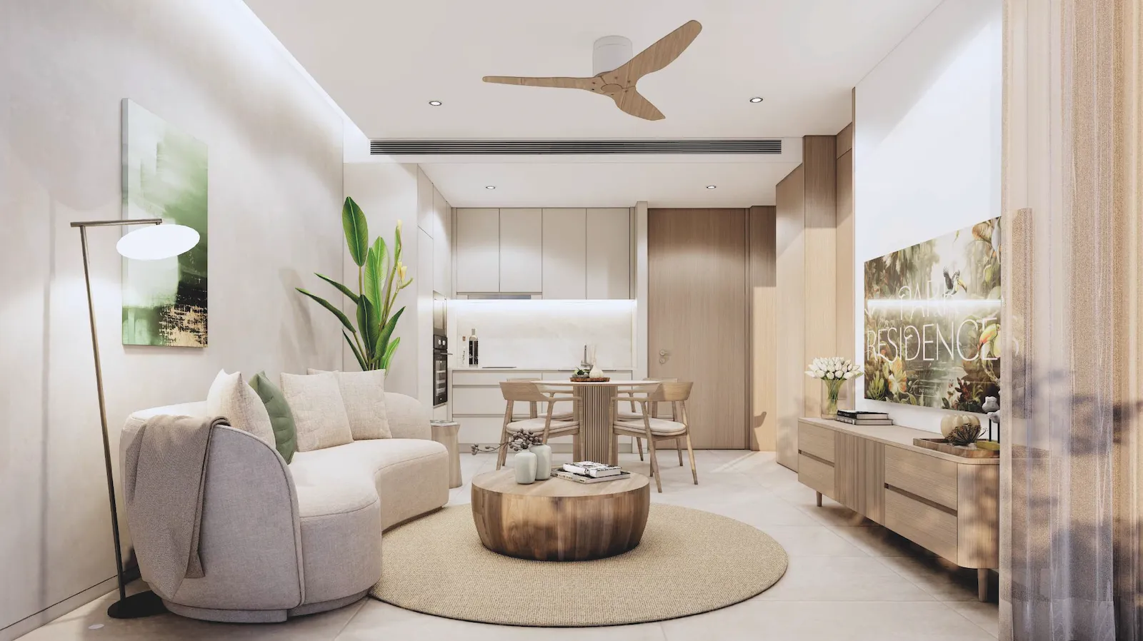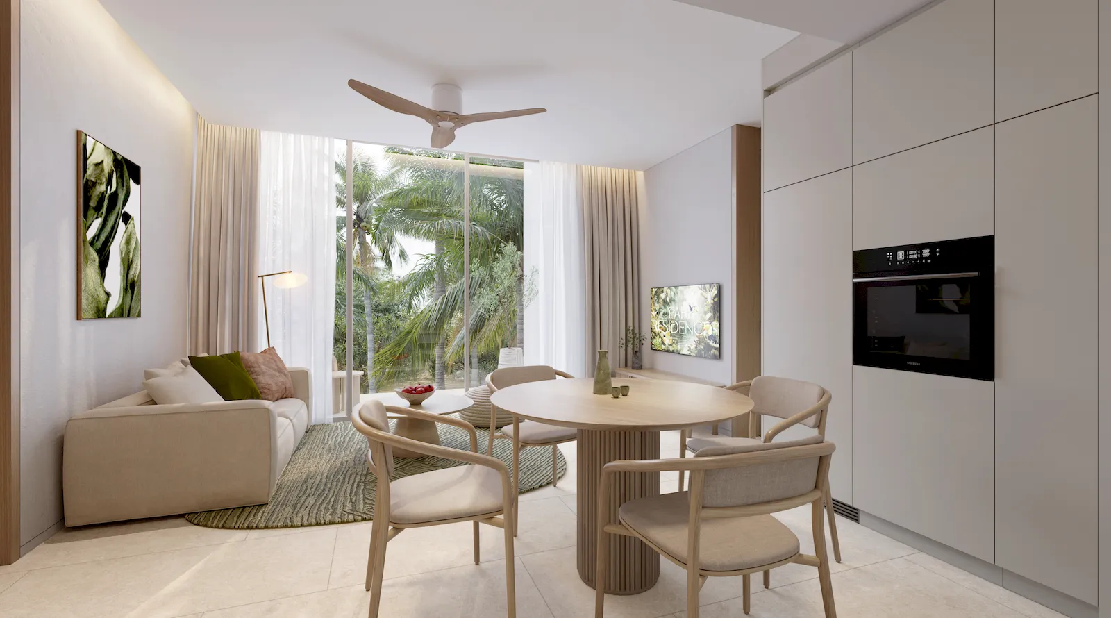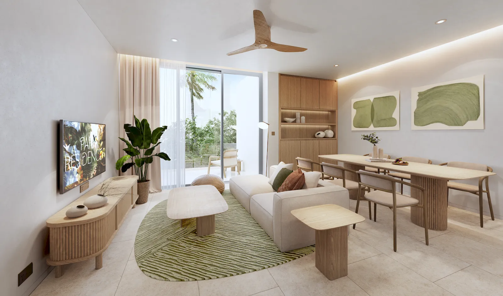 Homes are designed with bright open-plan interiors, premium fitted kitchens, and generous balconies or terraces overlooking lush gardens or the surrounding mountain backdrop. Spacious proportions, soft natural materials, and floor-to-ceiling glazing create a calm and inviting atmosphere suited to both full-time living and extended stays.