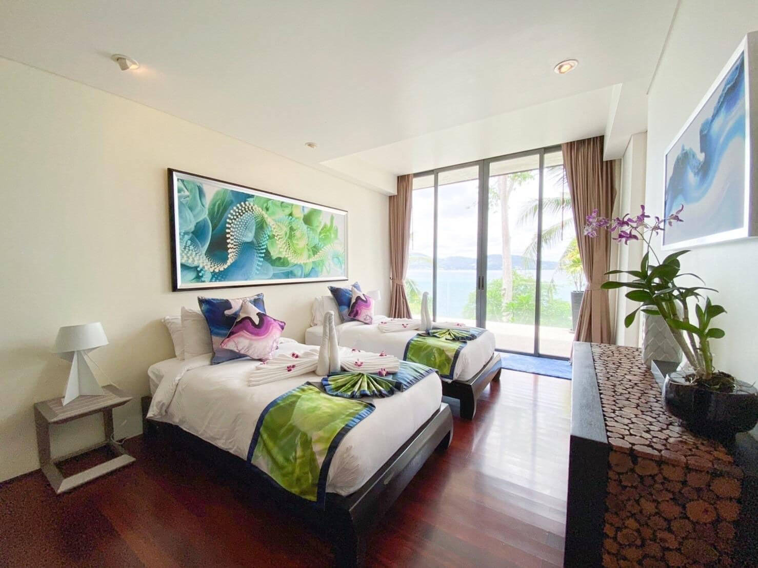 Panoramic seaviews, infinity-edge swimming pool, modern open-plan living, premium furnishings, entertainment room, private sauna, fully equipped gym, landscaped grounds, and proximity to Kamala Beach and nearby lifestyle destinations.