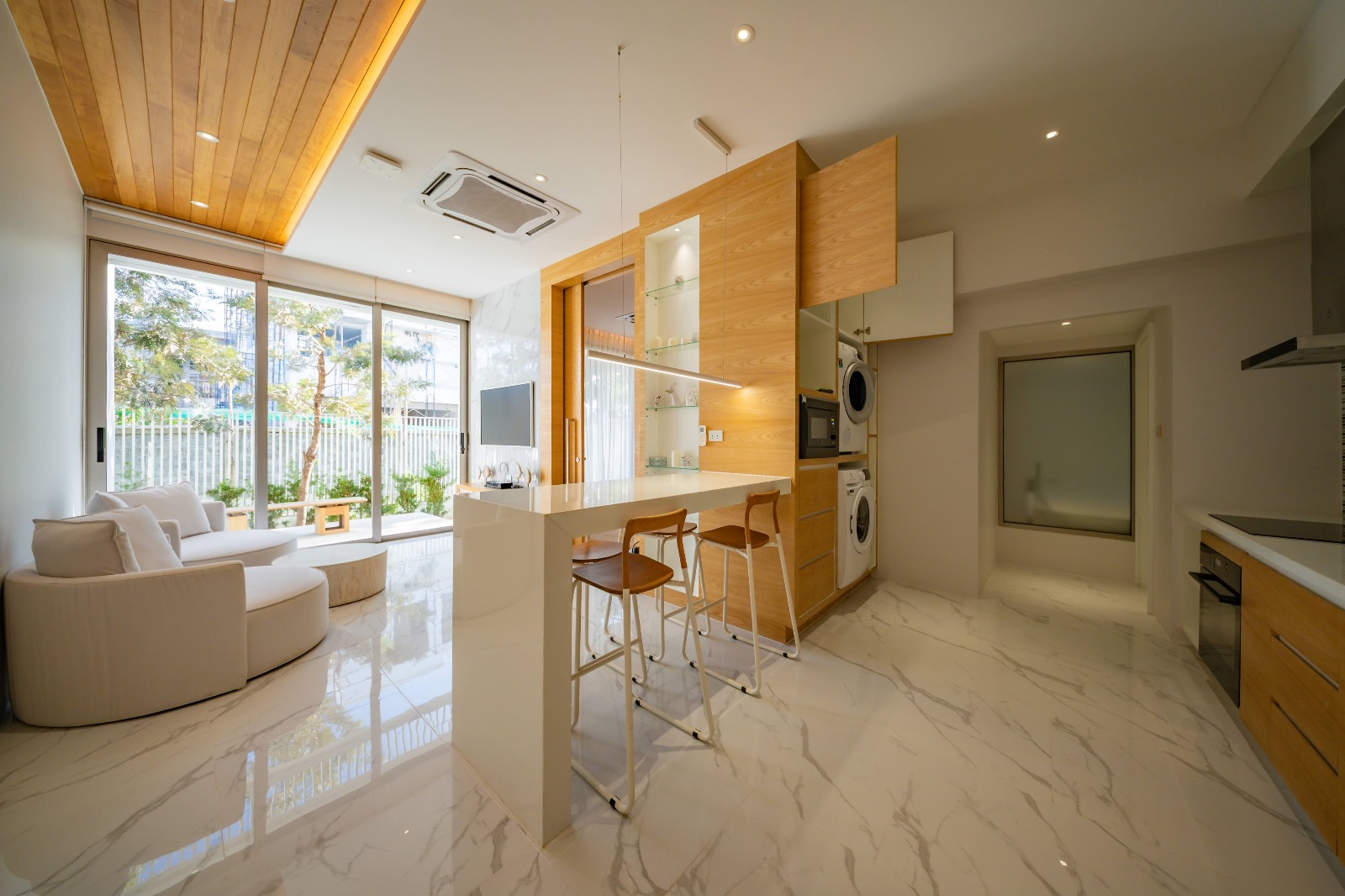 The villa spans three levels and has been thoughtfully planned to maximize living space and natural light. Four spacious ensuite bedrooms provide comfort for families or visiting guests, while the open-plan living and dining area offers a bright, inviting setting for daily life and entertaining. A fully equipped Western kitchen with premium appliances enhances convenience, and integrated smart-home features elevate functionality throughout the residence.