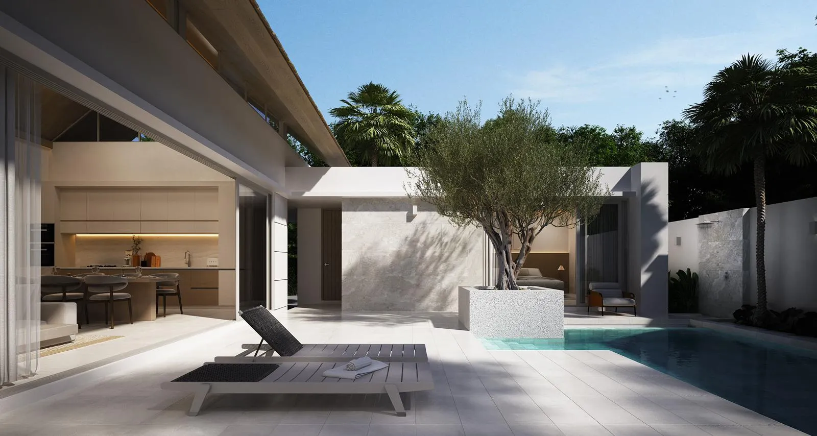 Three distinct floor plan configurations allow residents to select the layout that best suits their daily rhythm, from compact functional living to more expansive family arrangements. Each villa centres around a private swimming pool, complemented by sunken wet-bed loungers and a poolside pavilion that extends the home’s living space into the outdoors. Wide glass panels, considered proportions, and clean architectural lines contribute to an atmosphere of relaxed contemporary living.