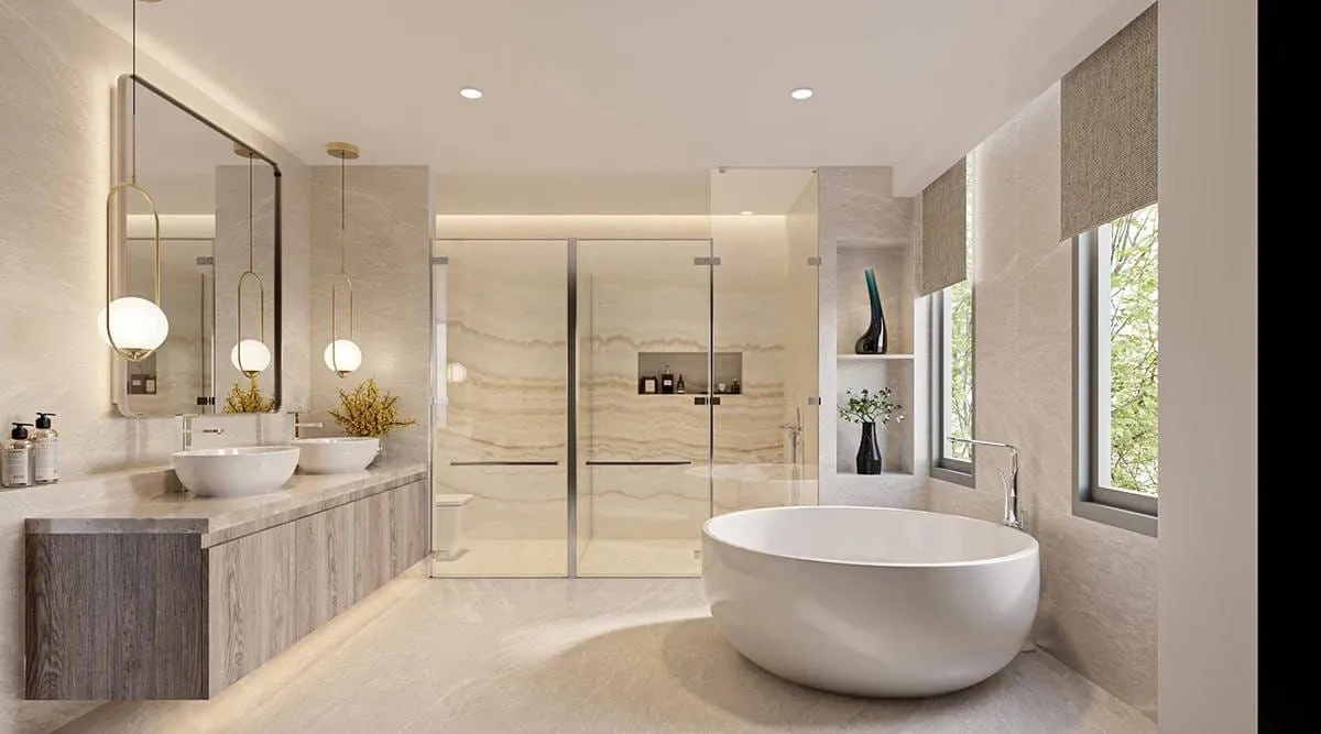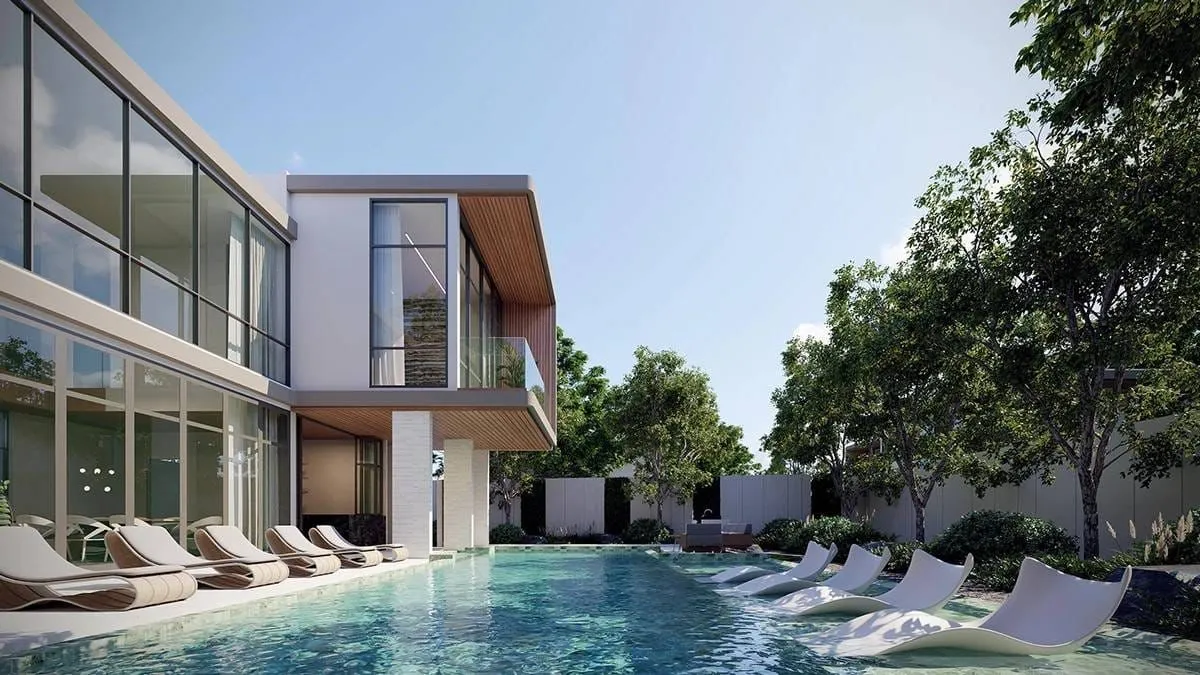The villa spans two levels and is arranged around a large private swimming pool, complemented by a separate children’s pool to support family living. Several configurations include a private elevator, creating ease of movement between floors and enhancing long-term comfort. The interiors introduce four bedrooms and five to six bathrooms depending on the selected layout, with both Western and Thai kitchens offering versatility for daily use and entertaining.