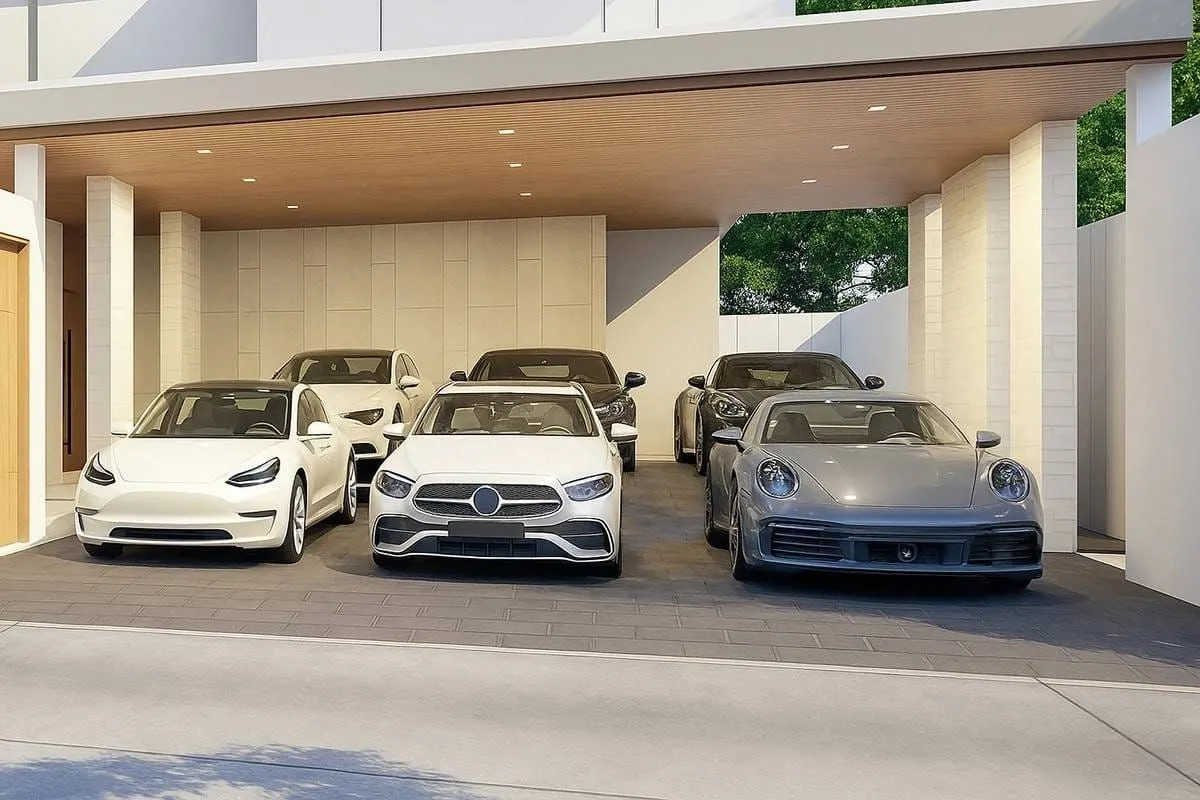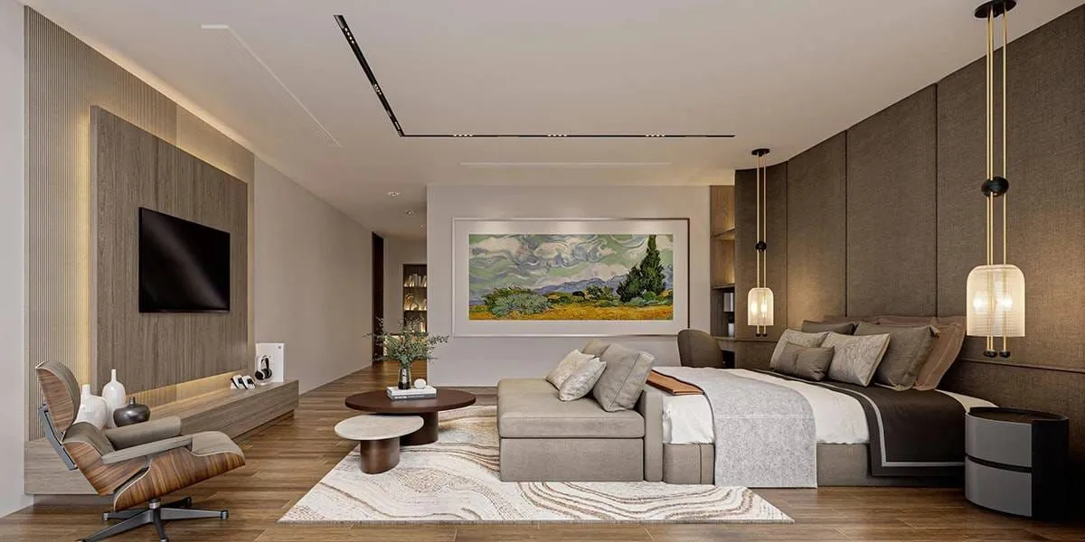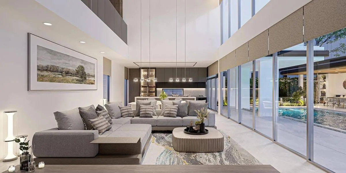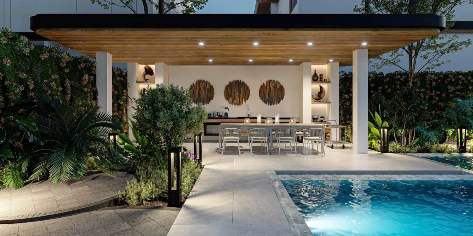 High-quality materials, refined detailing, and a focus on privacy define the overall atmosphere. Sunken loungers and a shaded poolside pavilion extend the living environment outdoors, creating a seamless connection between the home’s interior and its landscaped surroundings.