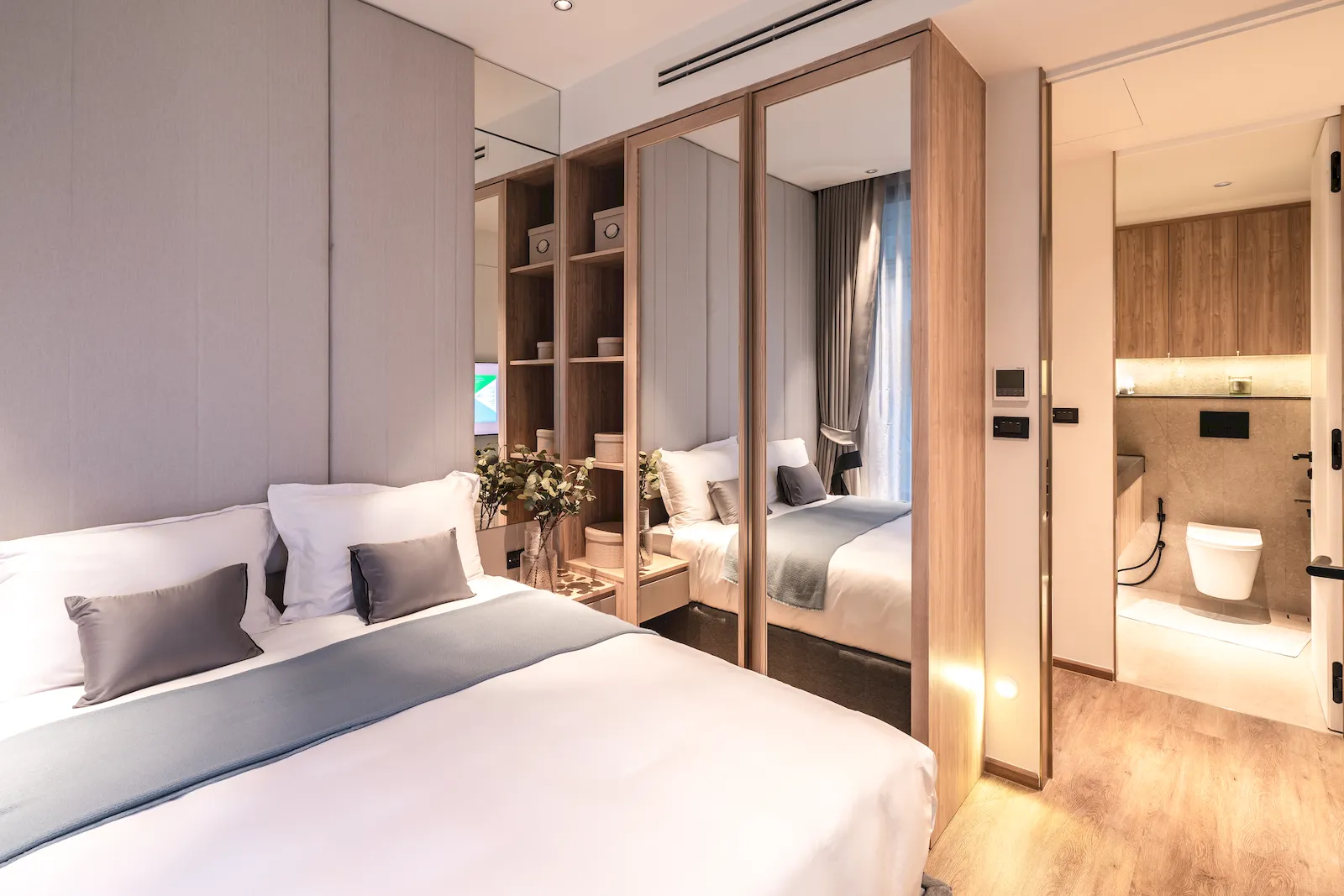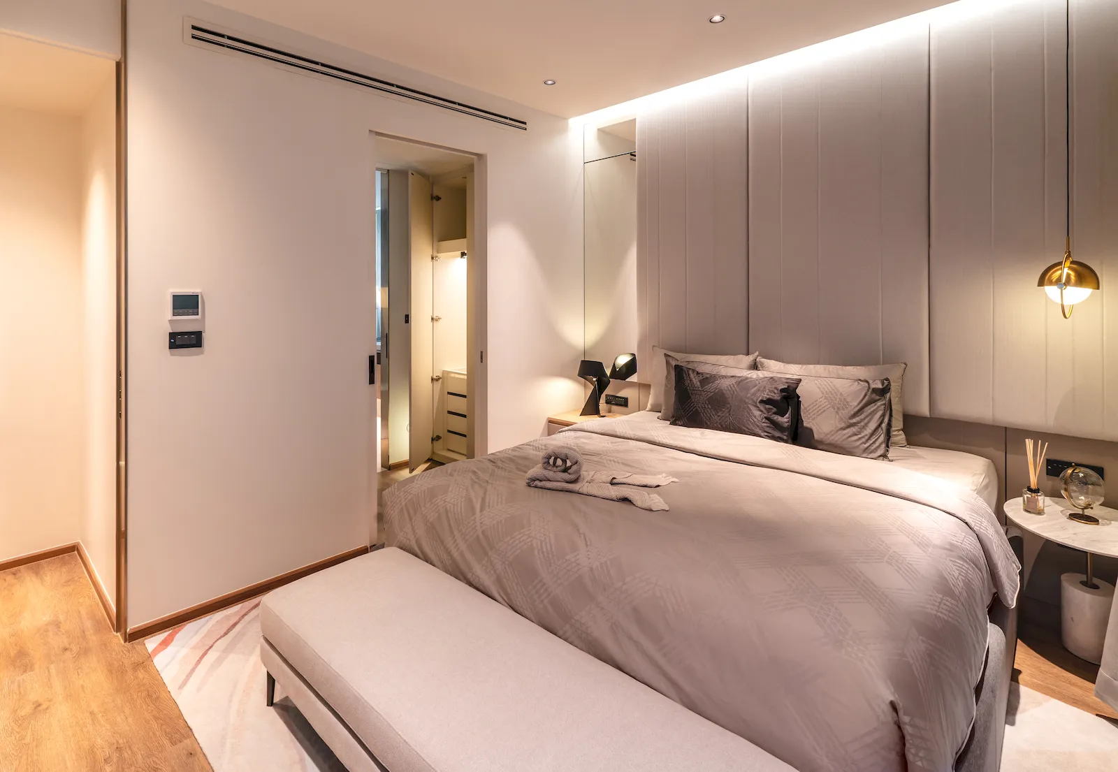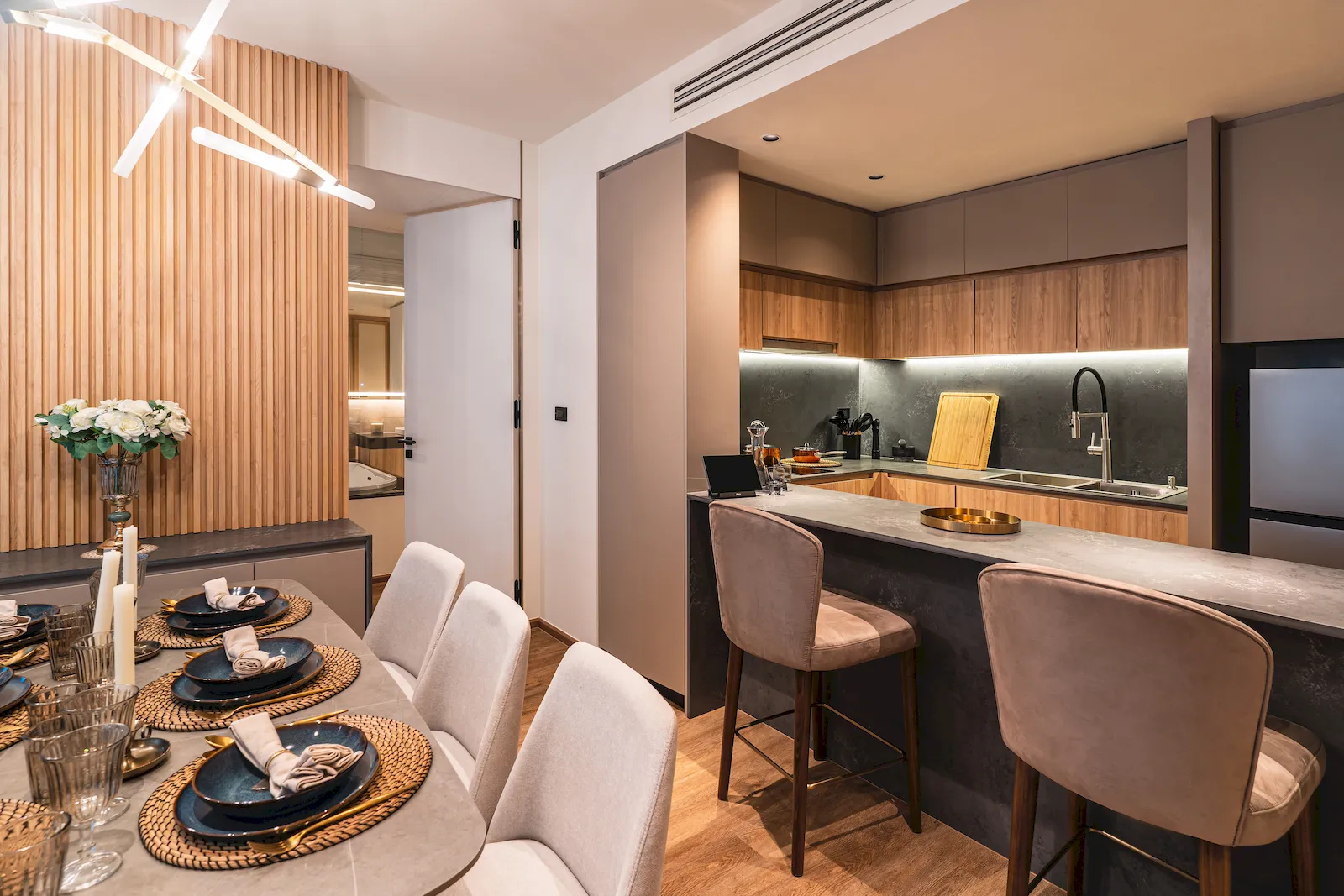 The residence sits within a modern condominium environment shaped by environmentally conscious principles, where greenery and natural light are central to the overall experience. Interiors follow a clean, contemporary aesthetic with efficient layouts, energy-saving systems, and materials chosen to enhance sustainability. The broader development incorporates landscaped spaces, walking paths, and areas designed to support a calm, resort-like atmosphere.